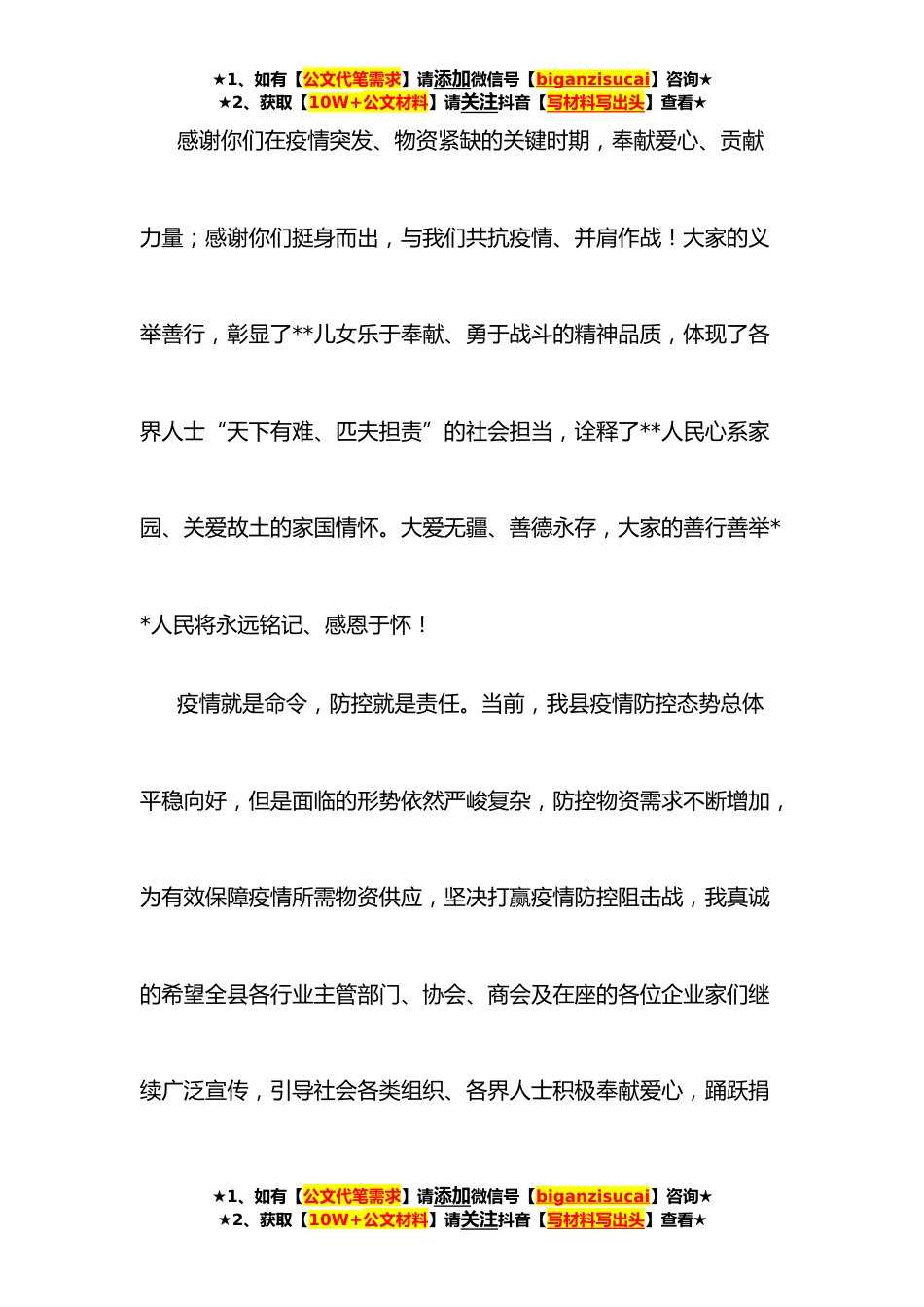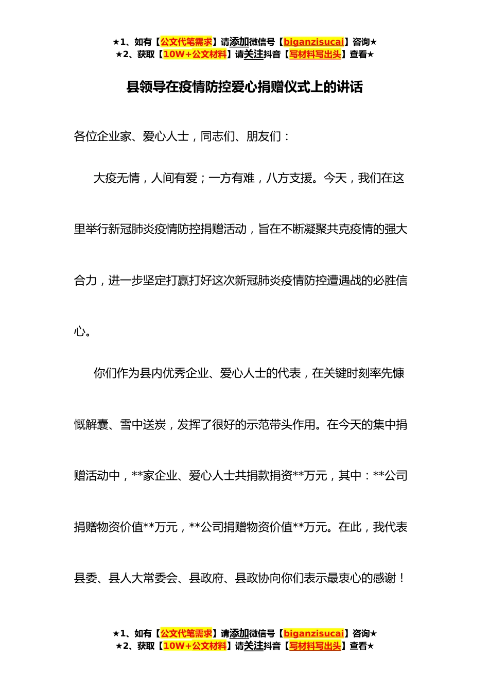 ★1、如有【公文代笔需求】请添加微信号【biganzisucai】咨询★★2、获取【10W+公文材料】请关注抖音【写材料写出头】查看★县领导在疫情防控爱心捐赠仪式上的讲话各位企业家、爱心人士,同志们、朋友们:大疫无情,人间有爱;一方有难,八方支援。今天,我们在这里举行新冠肺炎疫情防控捐赠活动,旨在不断凝聚共克疫情的强大合力,进一步坚定打赢打好这次新冠肺炎疫情防控遭遇战的必胜信心。你们作为县内优秀企业、爱心人士的代表,在关键时刻率先慷慨解囊、雪中送炭,发挥了很好的示范带头作用。在今天的集中捐赠活动中,**家企业、爱心人士共捐款捐资**万元,其中:**公司捐赠物资价值**万元,**公司捐赠物资价值**万元。在此,我代表县委、县人大常委会、县政府、县政协向你们表示最衷心的感谢!★1、如有【公...