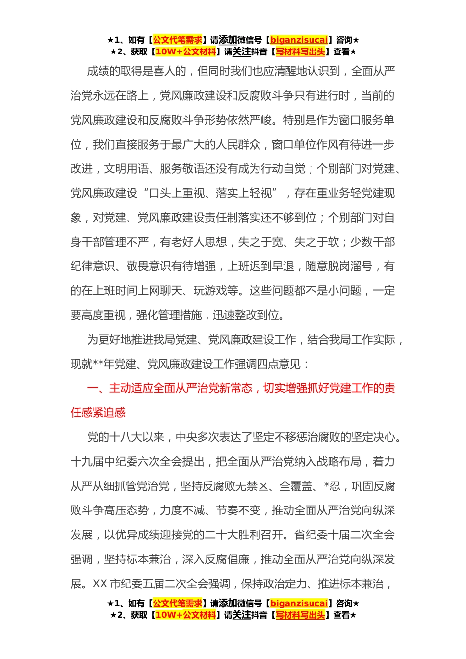 ★1、如有【公文代笔需求】请添加微信号【biganzisucai】咨询★★2、获取【10W+公文材料】请关注抖音【写材料写出头】查看★在局**年党建暨党风廉政建设专题会议上的讲话同志们:大家上午好!今天我们在这里召开党建、党风廉政建设专题会议,主要任务是:学习传达贯彻上级关于基层党组织标准化建设、中纪委十九届六次全会、省纪委十届二次全会、市纪委十三届二次全会精神,并就我局**年党建、党风廉政建设工作进行安排部署。刚才我们观看了警示教育片《滑落》,X同志宣读了《市人社局**党风廉政建设工作总结及**年党风廉政建设工作要点》,明确了今年全局党风廉政建设工作的重点、方向和要求,希望大家联系思想和工作实际,认真学习领会,抓好贯彻落实。过去的一年,局党组高度重视党建、党风廉政建设工作,多次召...