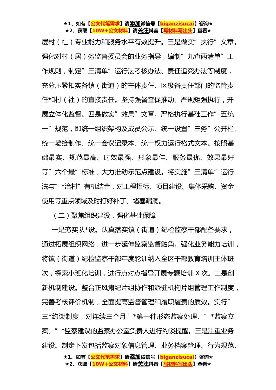 ★1、如有【公文代笔需求】请添加微信号【biganzisucai】咨询★★2、获取【10W+公文材料】请关注抖音【写材料写出头】查看★区清廉村居创建工作情况汇报去年以来,为着力推进全面从严治党向基层延伸,把清廉建设融入到党的基层组织建设、民主建设、社会管理等村居建设的方方面面,为乡村*提供坚强的保证,x区积极探索建设清廉村居的新路径,按照清源固廉、监督护廉、公开促廉、文化润廉的建设目标,打造班子清廉、干部清正、村务清爽、民风清朗的村居环境,推动建设美丽XX、幸福XX、清廉XX。现将有关情况汇报如下:一、主要做法(一)聚焦规范用权,强化制度基础。一是做实”编制”文章,扎紧制度笼子。由区农业农村局等X个牵头部门和区住建局等X个责任部门,*X个镇(街道),按照依法有据、便于操作、易于监督的...