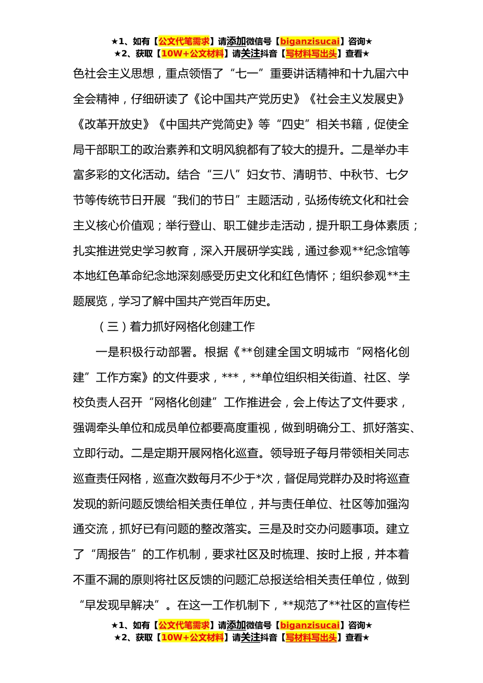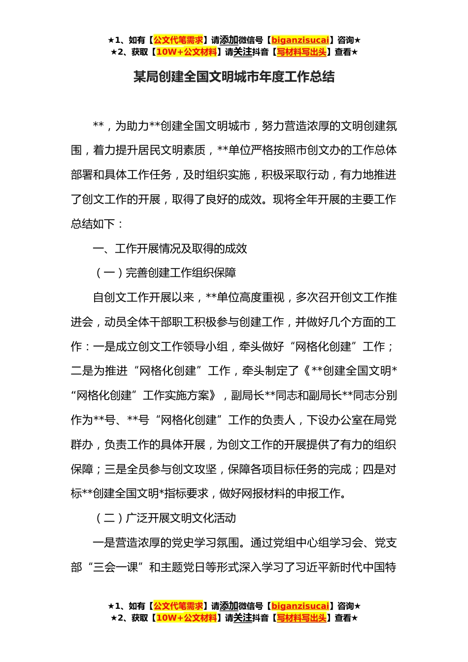 ★1、如有【公文代笔需求】请添加微信号【biganzisucai】咨询★★2、获取【10W+公文材料】请关注抖音【写材料写出头】查看★某局创建全国文明城市年度工作总结**,为助力**创建全国文明城市,努力营造浓厚的文明创建氛围,着力提升居民文明素质,**单位严格按照市创文办的工作总体部署和具体工作任务,及时组织实施,积极采取行动,有力地推进了创文工作的开展,取得了良好的成效。现将全年开展的主要工作总结如下:一、工作开展情况及取得的成效(一)完善创建工作组织保障自创文工作开展以来,**单位高度重视,多次召开创文工作推进会,动员全体干部职工积极参与创建工作,并做好几个方面的工作:一是成立创文工作领导小组,牵头做好“网格化创建”工作;二是为推进“网格化创建”工作,牵头制定了《**创建全国...