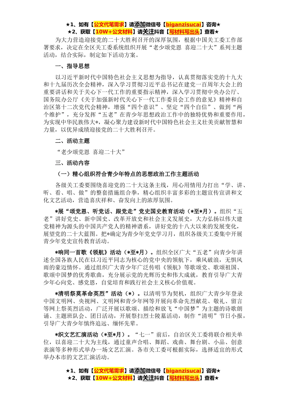 ★1、如有【公文代笔需求】请添加微信号【biganzisucai】咨询★★2、获取【10W+公文材料】请关注抖音【写材料写出头】查看★为大力营造迎接党的二十大胜利召开的深厚氛围,根据中国关工委工作部署要求,决定在全区关工委系统组织开展“老少颂党恩喜迎二十大”系列主题活动,结合实际,制定如下活动方案。一、指导思想以习近平新时代中国特色社会主义思想为指导,认真贯彻落实党的十九大和十九届历次全会精神,深入学习贯彻习近平总书记在建党一百周年大会上的重要讲话和关于关心下一代工作的重要指示精神,深入学习贯彻中央办公厅、国务院办公厅《关于加强新时代关心下一代工作委员会工作的意见》精神和自治区第十二次党代会精神,增强“四个意识”、坚定“四个自信”、做到“两个维护”,充分发挥“五老”在青少...