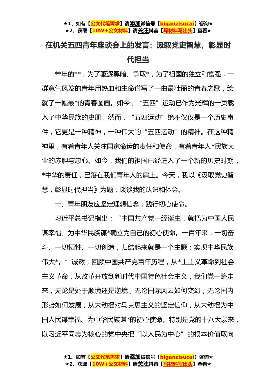 ★1、如有【公文代笔需求】请添加微信号【biganzisucai】咨询★★2、获取【10W+公文材料】请关注抖音【写材料写出头】查看★在机关五四青年座谈会上的发言:汲取党史智慧,彰显时代担当**年的**,为了驱逐黑暗、争取*,为了祖国的独立和富强,一群意气风发的青年用热血和生命谱写了一曲最壮丽的青春之歌,绘就了一幅最*的青春图画。如今,“五四”运动已作为光辉的一页载入了中华民族的史册。然而,“五四运动”绝不仅仅是一个历史事件,它更是一种精神,一种伟大的“五四运动”的精神。在这种精神里,有着青年人关注国家命运的责任和使命,有着青年人*民族大业的赤胆与忠心。如今,我们的祖国已经进入了一个新的历史时期,*中华的责任,已落在我们青年人的肩上。今天,我以《汲取党史智慧,彰显时代担当》为题,...