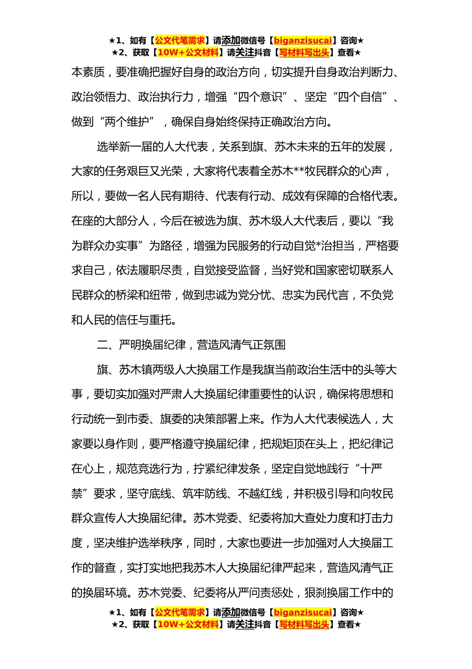 ★1、如有【公文代笔需求】请添加微信号【biganzisucai】咨询★★2、获取【10W+公文材料】请关注抖音【写材料写出头】查看★人大代表候选人初步人选集体谈话会讲话稿同志们:现在开始开会。今天在座的各位的身份都是旗、苏木级人大代表候选人初步人选,今天把大家召集到一起,主要是按照上级部门关于旗、苏木两级人大代表换届工作的要求,同大家进行一次集体谈话,一是跟大家见个面、谈一谈了解掌握一下大家的实际情况,二是需要向大家再强调几点有关人大代表换届工作的要求。集体谈话既是组织程序的要求,也是换届形势的需要,当前我苏木人大换届选举工作一环紧扣一环,时间紧、任务重、要求高。人大换届选举是全旗、全苏木人民群众生活中的一件大事,我们要为未来的五年绘出好蓝图、选出好代表,为进一步提升我...