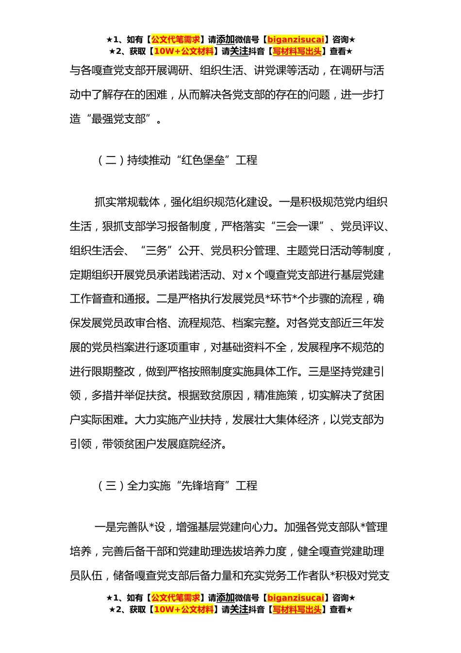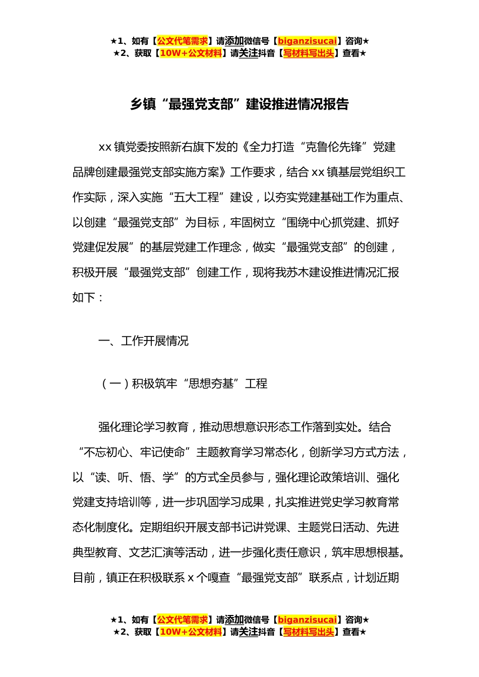 ★1、如有【公文代笔需求】请添加微信号【biganzisucai】咨询★★2、获取【10W+公文材料】请关注抖音【写材料写出头】查看★乡镇“最强党支部”建设推进情况报告xx镇党委按照新右旗下发的《全力打造“克鲁伦先锋”党建品牌创建最强党支部实施方案》工作要求,结合xx镇基层党组织工作实际,深入实施“五大工程”建设,以夯实党建基础工作为重点、以创建“最强党支部”为目标,牢固树立“围绕中心抓党建、抓好党建促发展”的基层党建工作理念,做实“最强党支部”的创建,积极开展“最强党支部”创建工作,现将我苏木建设推进情况汇报如下:一、工作开展情况(一)积极筑牢“思想夯基”工程强化理论学习教育,推动思想意识形态工作落到实处。结合“不忘初心、牢记使命”主题教育学习常态化,创新学习方式方法,以“...