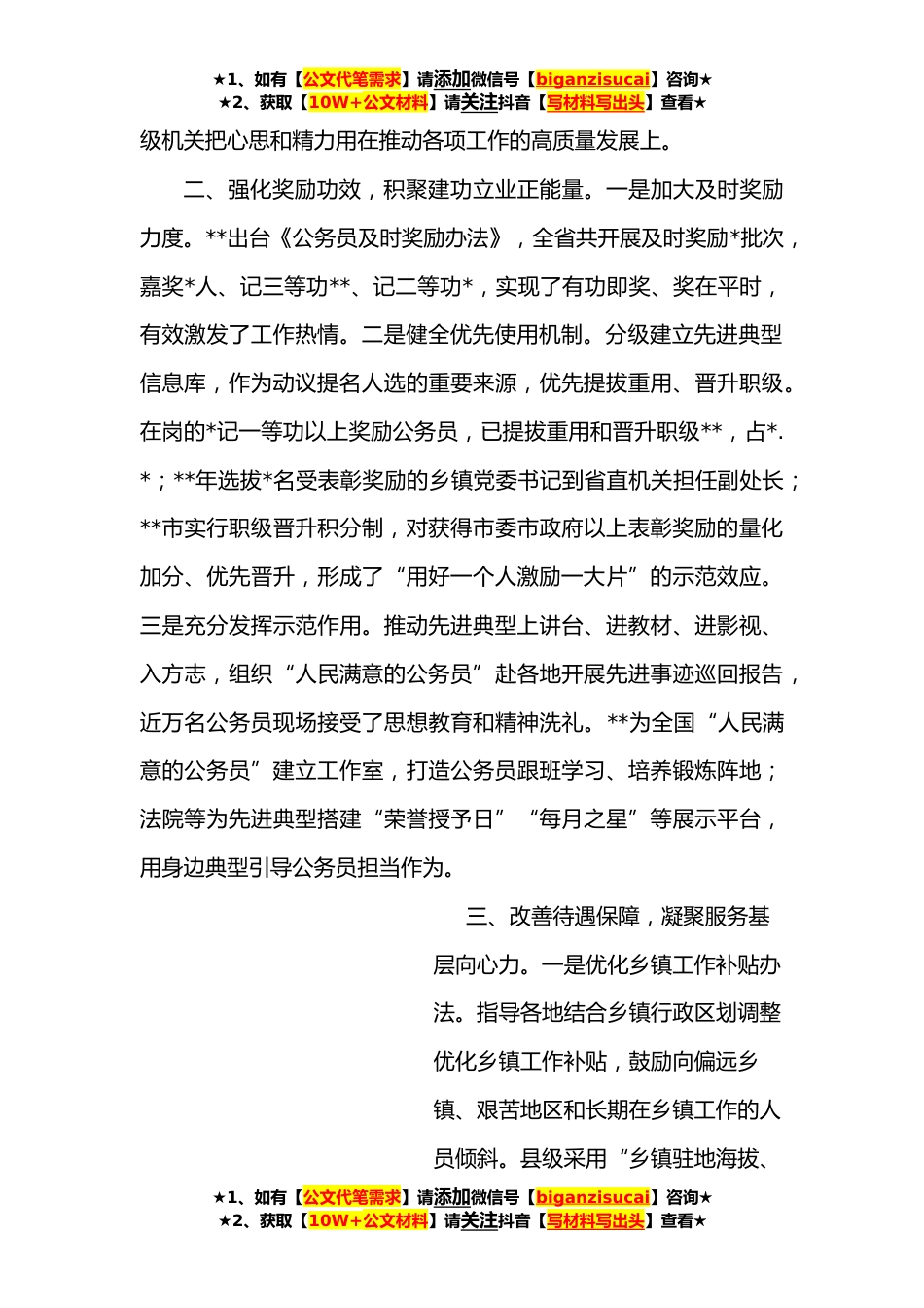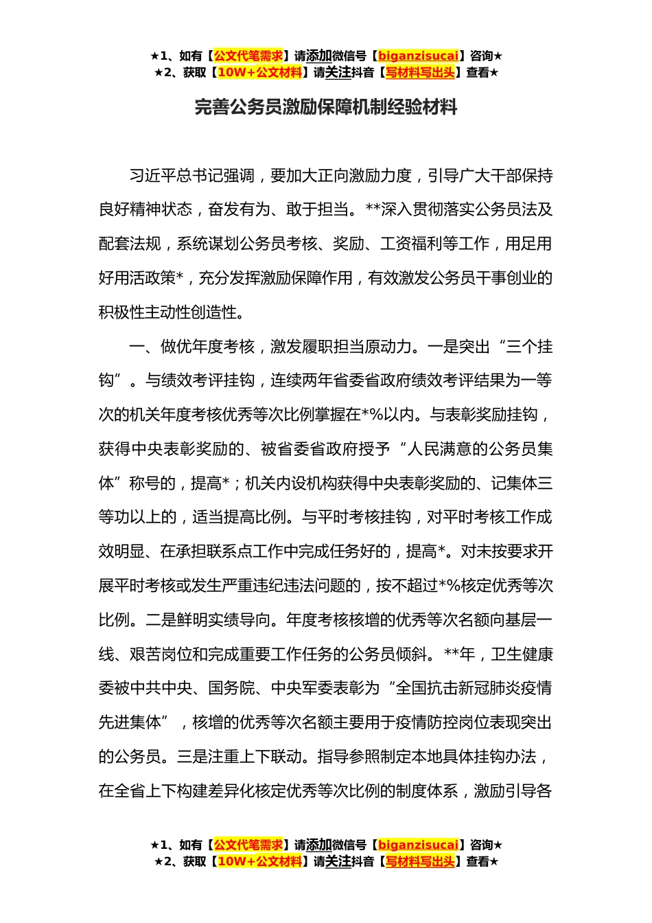 ★1、如有【公文代笔需求】请添加微信号【biganzisucai】咨询★★2、获取【10W+公文材料】请关注抖音【写材料写出头】查看★完善公务员激励保障机制经验材料习近平总书记强调,要加大正向激励力度,引导广大干部保持良好精神状态,奋发有为、敢于担当。**深入贯彻落实公务员法及配套法规,系统谋划公务员考核、奖励、工资福利等工作,用足用好用活政策*,充分发挥激励保障作用,有效激发公务员干事创业的积极性主动性创造性。一、做优年度考核,激发履职担当原动力。一是突出“三个挂钩”。与绩效考评挂钩,连续两年省委省政府绩效考评结果为一等次的机关年度考核优秀等次比例掌握在*%以内。与表彰奖励挂钩,获得中央表彰奖励的、被省委省政府授予“人民满意的公务员集体”称号的,提高*;机关内设机构获得中央表...
