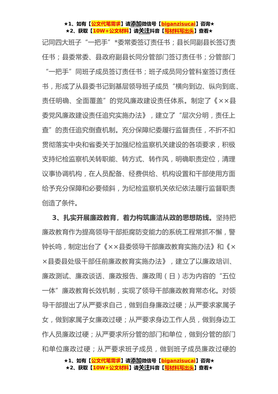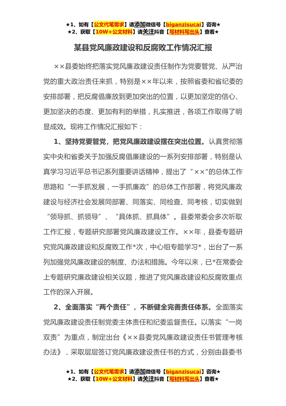 ★1、如有【公文代笔需求】请添加微信号【biganzisucai】咨询★★2、获取【10W+公文材料】请关注抖音【写材料写出头】查看★某县党风廉政建设和反腐败工作情况汇报××县委始终把落实党风廉政建设责任制作为党要管党、从严治党的重大政治责任来抓,特别是××年以来,按照省委和省纪委的安排部署,把反腐倡廉放到更加突出的位置,以更加坚定的信心、更加坚决的态度、更加有利的举措,扎实推进,各项工作取得了明显成效。现将工作情况汇报如下:1、坚持党要管党,把党风廉政建设摆在突出位置。认真贯彻落实中央和省委关于加强反腐倡廉建设的一系列安排部署,特别是认真学习习近平总书记系列重要讲话精神,提出了“××”的总体工作思路和“一手抓发展,一手抓廉政”的总体工作部署,将党风廉政建设与经济社会发展同...