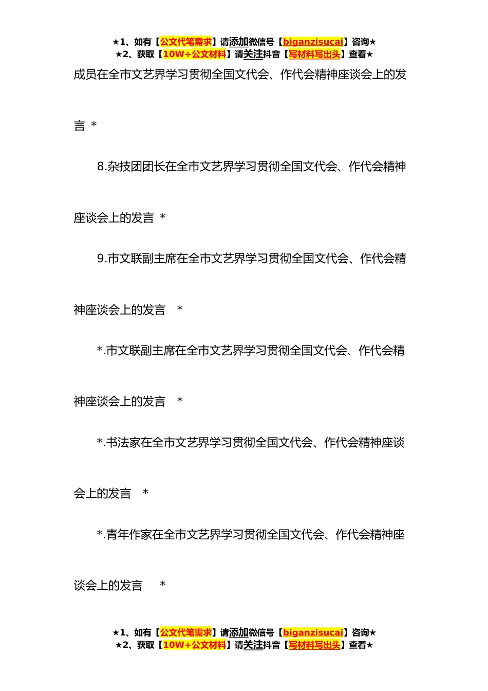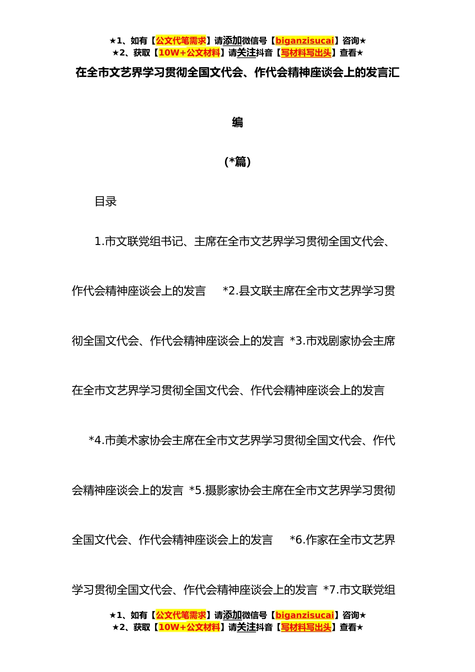 ★1、如有【公文代笔需求】请添加微信号【biganzisucai】咨询★★2、获取【10W+公文材料】请关注抖音【写材料写出头】查看★在全市文艺界学习贯彻全国文代会、作代会精神座谈会上的发言汇编(*篇)目录1.市文联党组书记、主席在全市文艺界学习贯彻全国文代会、作代会精神座谈会上的发言*2.县文联主席在全市文艺界学习贯彻全国文代会、作代会精神座谈会上的发言*3.市戏剧家协会主席在全市文艺界学习贯彻全国文代会、作代会精神座谈会上的发言*4.市美术家协会主席在全市文艺界学习贯彻全国文代会、作代会精神座谈会上的发言*5.摄影家协会主席在全市文艺界学习贯彻全国文代会、作代会精神座谈会上的发言*6.作家在全市文艺界学习贯彻全国文代会、作代会精神座谈会上的发言*7.市文联党组★1、如有【公文代笔需求】请添...