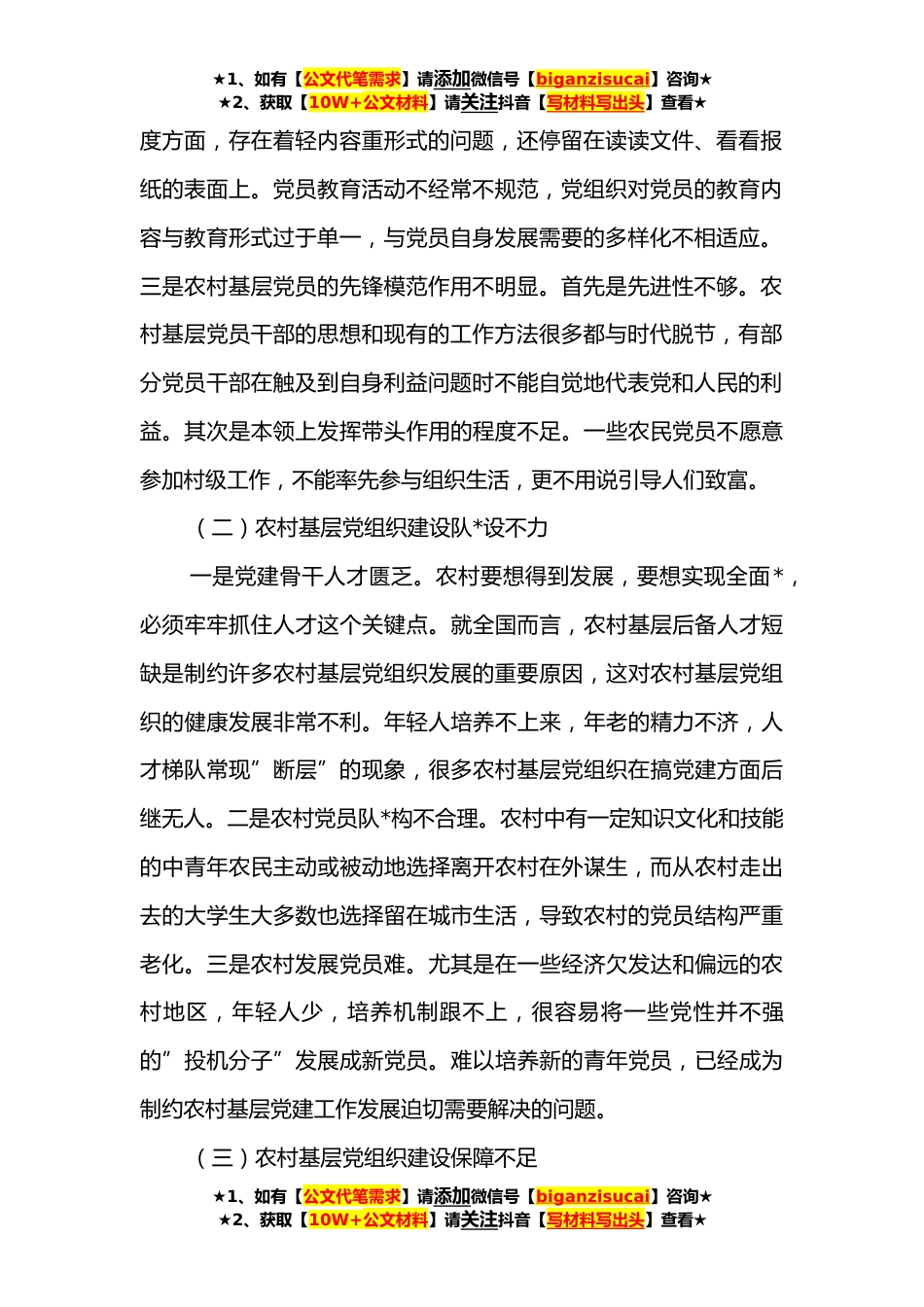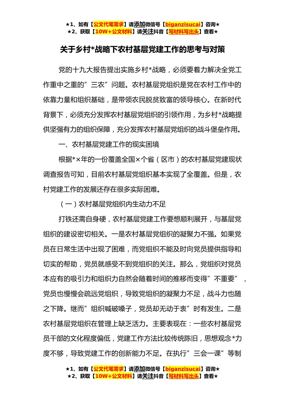 ★1、如有【公文代笔需求】请添加微信号【biganzisucai】咨询★★2、获取【10W+公文材料】请关注抖音【写材料写出头】查看★关于乡村*战略下农村基层党建工作的思考与对策党的十九大报告提出实施乡村*战略,必须要着力解决全党工作重中之重的”三农”问题。农村基层党组织是党在农村工作中的依靠力量和组织基础,是带领农民脱贫致富的领导核心。在新时代背景下,必须充分发挥农村基层党组织的引领作用,为乡村*战略提供坚强有力的组织保障,充分发挥农村基层党组织的战斗堡垒作用。一、农村基层党建工作的现实困境根据*×年的一份覆盖全国×个省(区市)的农村基层党建现状调查报告可知,目前农村基层党组织基本实现了全覆盖。但是,农村党建工作的发展还存在很多实际困难。(一)农村基层党组织内生动力不足打铁...