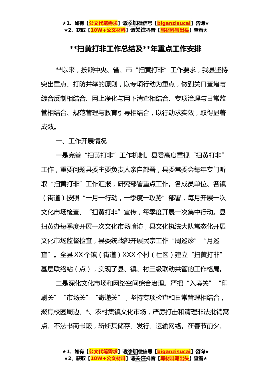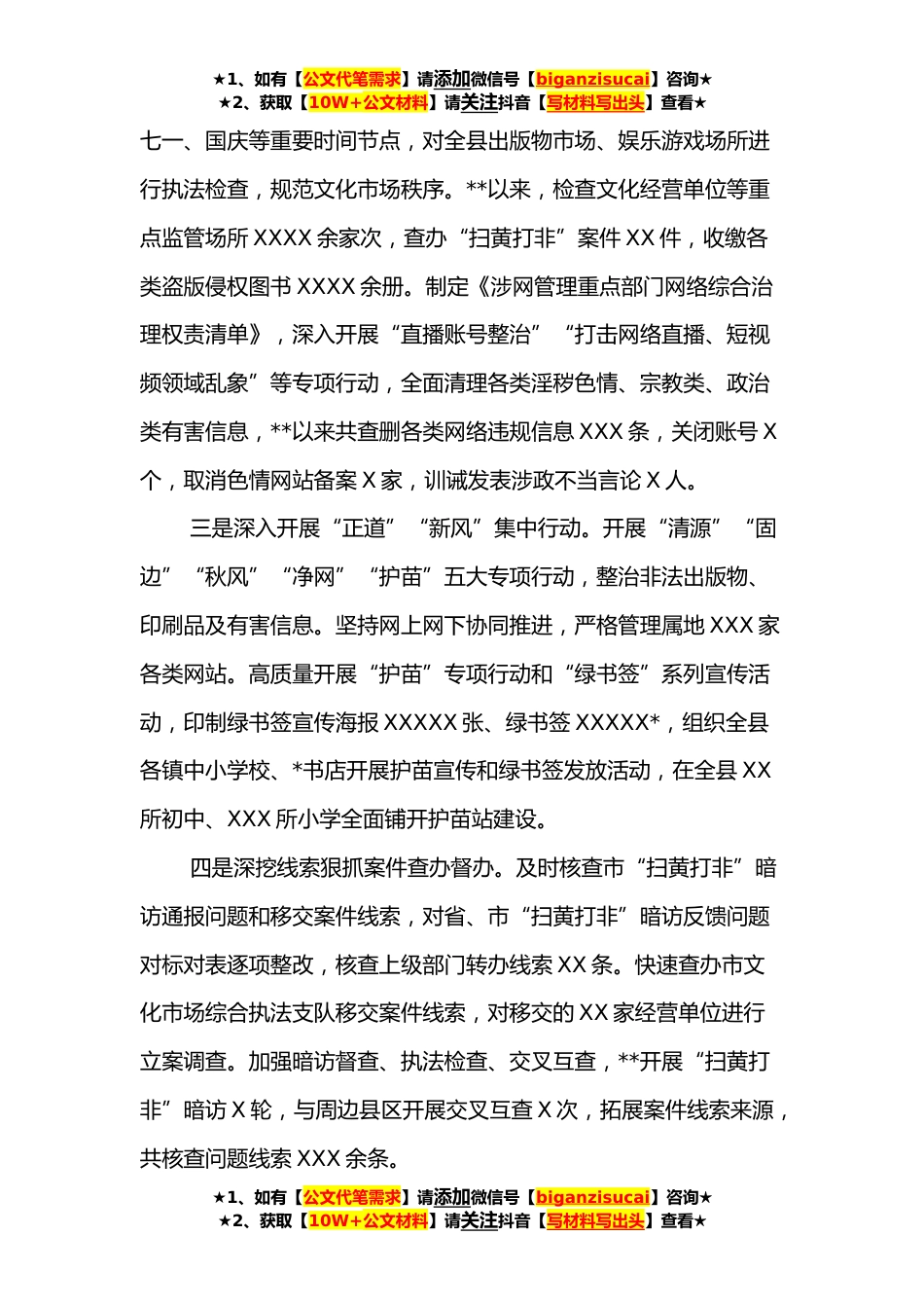★1、如有【公文代笔需求】请添加微信号【biganzisucai】咨询★★2、获取【10W+公文材料】请关注抖音【写材料写出头】查看★**扫黄打非工作总结及**年重点工作安排**以来,按照中央、省、市“扫黄打非”工作要求,我县坚持突出重点、打防并举的原则,以专项行动为重点,做到关口查堵与综合反制相结合、网上净化与网下清查相结合、专项治理与日常监管相结合、规范管理与教育引导相结合,以行动求实效,取得显著成效。一、工作开展情况一是完善“扫黄打非”工作机制。县委高度重视“扫黄打非”工作,重要问题县委主要负责人亲自部署,县委常委会每年专门听取“扫黄打非”工作汇报,研究部署重点工作。各成员单位、各镇(街道)按照“一月一行动,一季度一攻势”部署,每月开展一次文化市场检查、“扫黄打非”宣传,...