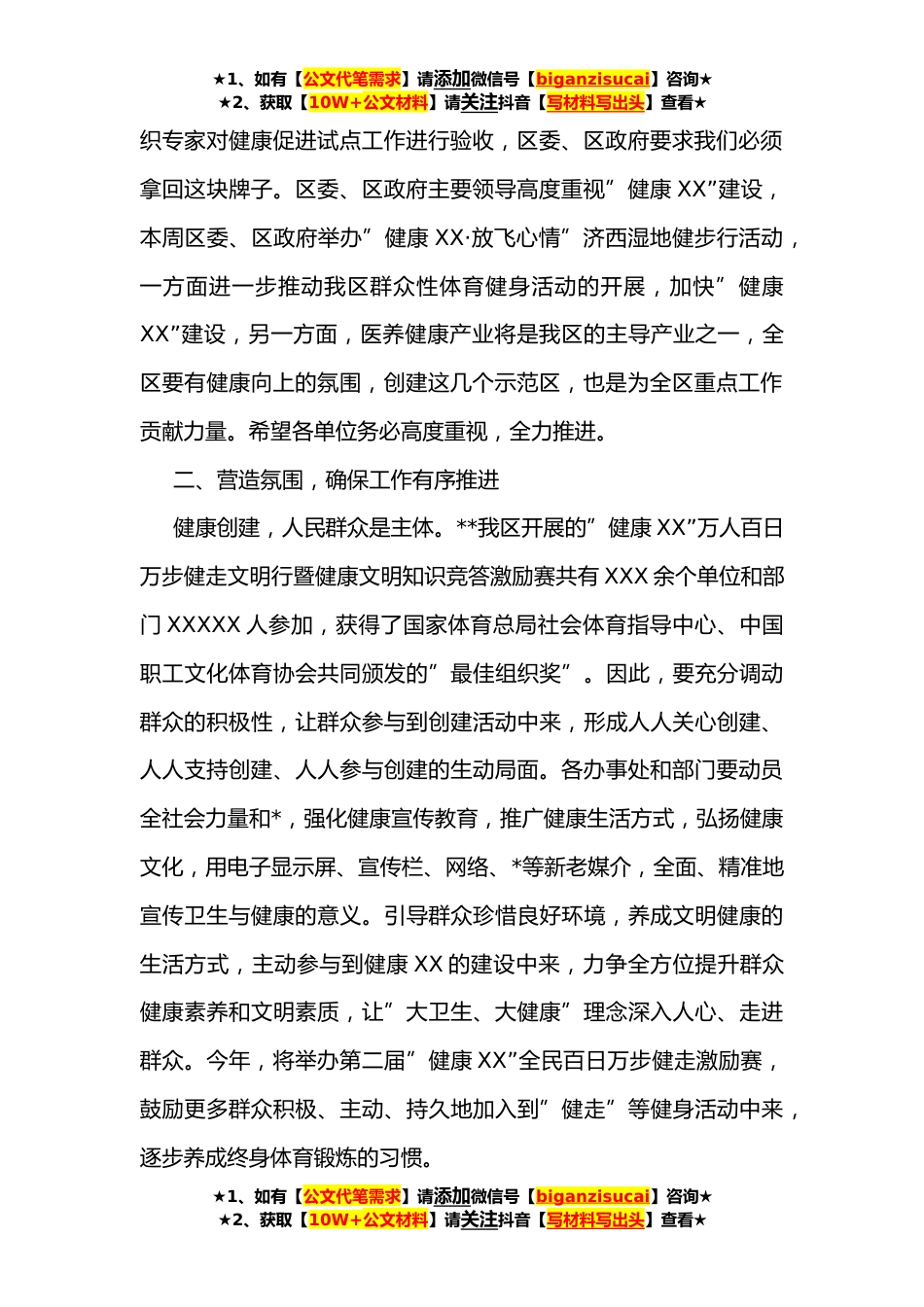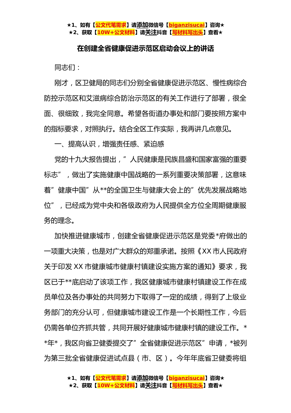 ★1、如有【公文代笔需求】请添加微信号【biganzisucai】咨询★★2、获取【10W+公文材料】请关注抖音【写材料写出头】查看★在创建全省健康促进示范区启动会议上的讲话同志们:刚才,区卫健局的同志们分别全省健康促进示范区、慢性病综合防控示范区和艾滋病综合防治示范区的有关工作进行了部署,很全面、很细致,我完全同意。希望各街道办事处和部门要按照方案中的指标要求,对照执行。结合全区工作实际,我再讲几点意见。一、提高认识,增强责任感、紧迫感党的十九大报告提出,”人民健康是民族昌盛和国家富强的重要标志”,做出了实施健康中国战略的一系列重要决策部署,这意味着”健康中国”从**的全国卫生与健康大会上的”优先发展战略地位”,已经成为党中央和各级政府为人民提供全方位全周期健康服务的理念...