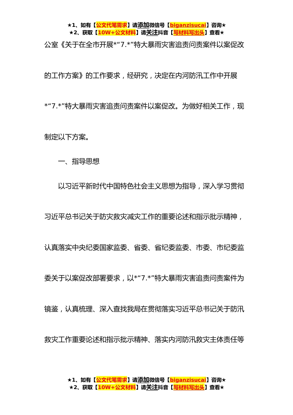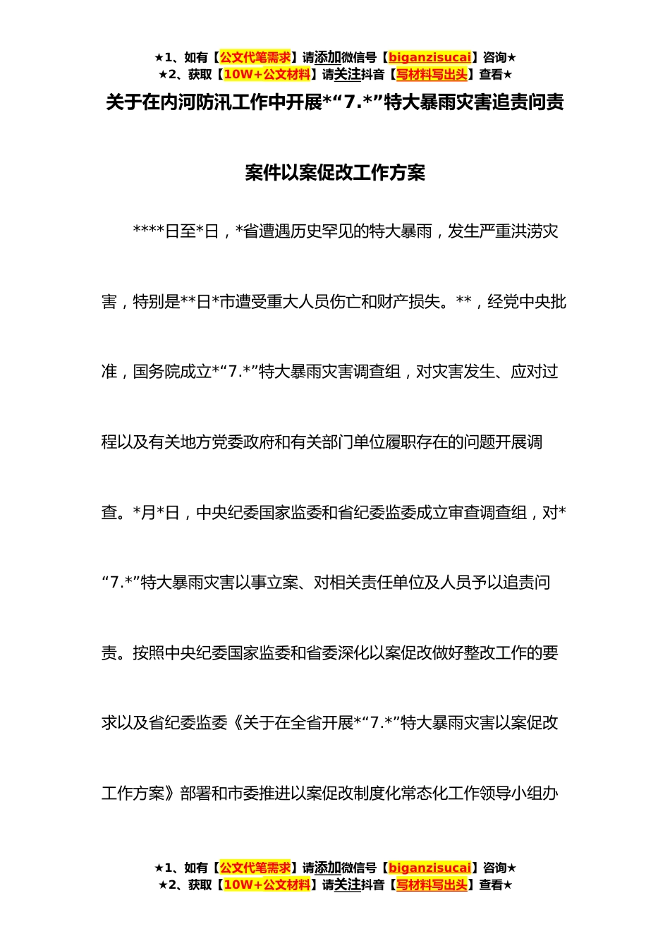 ★1、如有【公文代笔需求】请添加微信号【biganzisucai】咨询★★2、获取【10W+公文材料】请关注抖音【写材料写出头】查看★关于在内河防汛工作中开展*“7.*”特大暴雨灾害追责问责案件以案促改工作方案****日至*日,*省遭遇历史罕见的特大暴雨,发生严重洪涝灾害,特别是**日*市遭受重大人员伤亡和财产损失。**,经党中央批准,国务院成立*“7.*”特大暴雨灾害调查组,对灾害发生、应对过程以及有关地方党委政府和有关部门单位履职存在的问题开展调查。*月*日,中央纪委国家监委和省纪委监委成立审查调查组,对*“7.*”特大暴雨灾害以事立案、对相关责任单位及人员予以追责问责。按照中央纪委国家监委和省委深化以案促改做好整改工作的要求以及省纪委监委《关于在全省开展*“7.*”特大暴雨灾害以案促改工作方案》...