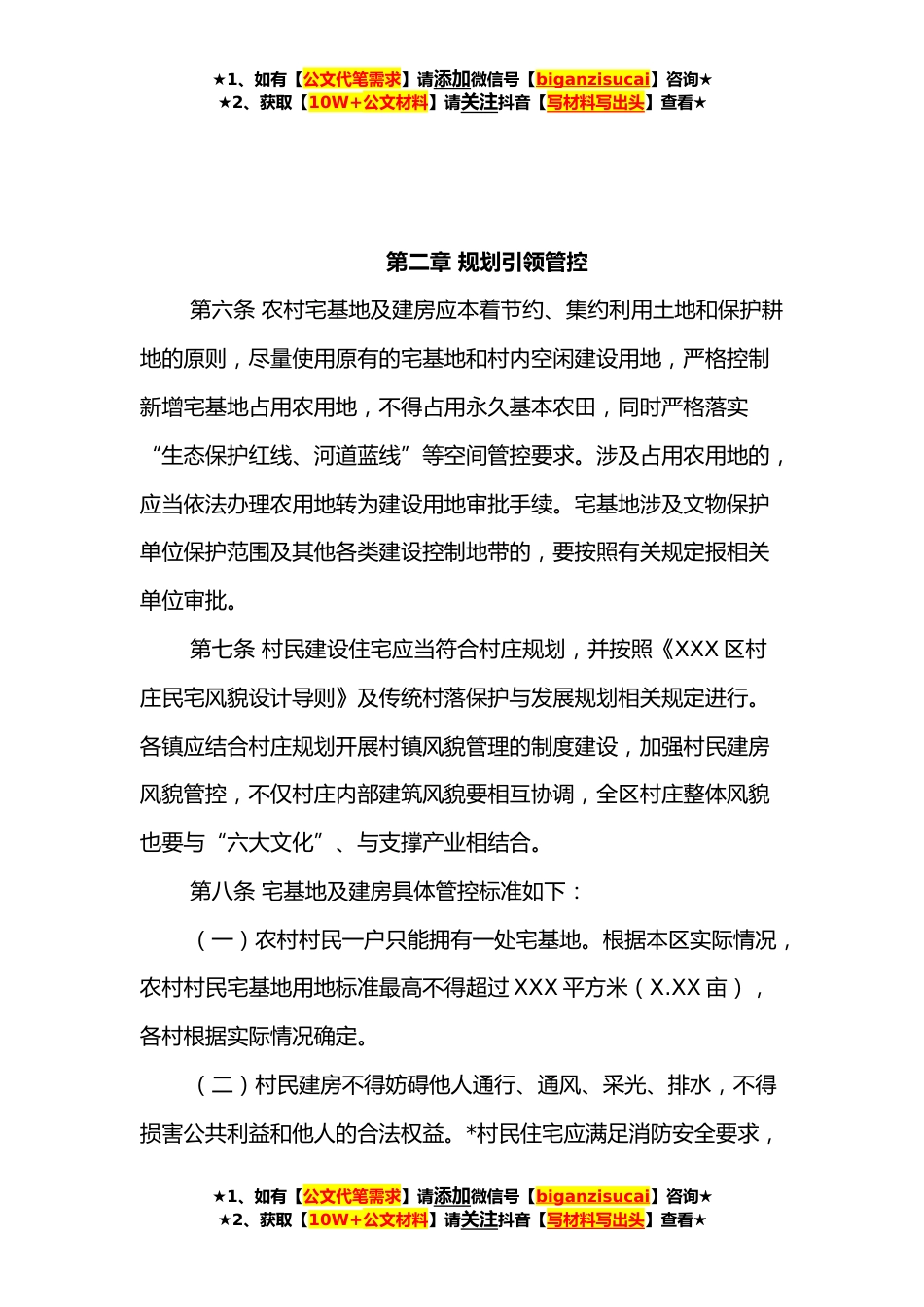 ★1、如有【公文代笔需求】请添加微信号【biganzisucai】咨询★★2、获取【10W+公文材料】请关注抖音【写材料写出头】查看★XXX区农村宅基地及建房管理办法(**)第一章总则第一条为加强XXX区农村宅基地及建房管理,完善宅基地管理制度,切实落实“户有所居”,根据《中华人民*国土地管理法》、《XX市城乡规划条例》、《XX市人民政府关于落实户有所居加强农村宅基地及房屋建设管理的指导意见》(京政发〔XXXX〕XX号)以及《关于进一步加强和规范农村宅基地及建房审批管理的通知》(京政农函〔XXXX〕XX号)等法律法规及相关政策规定,结合本区实际,制定本办法。第二条本办法适用于XXX区行政区域内宅基地建房规划、申请、审批和建设管理。第三条本办法所称农村宅基地是指经依法审批取得的,农村村民用于建造住宅及...