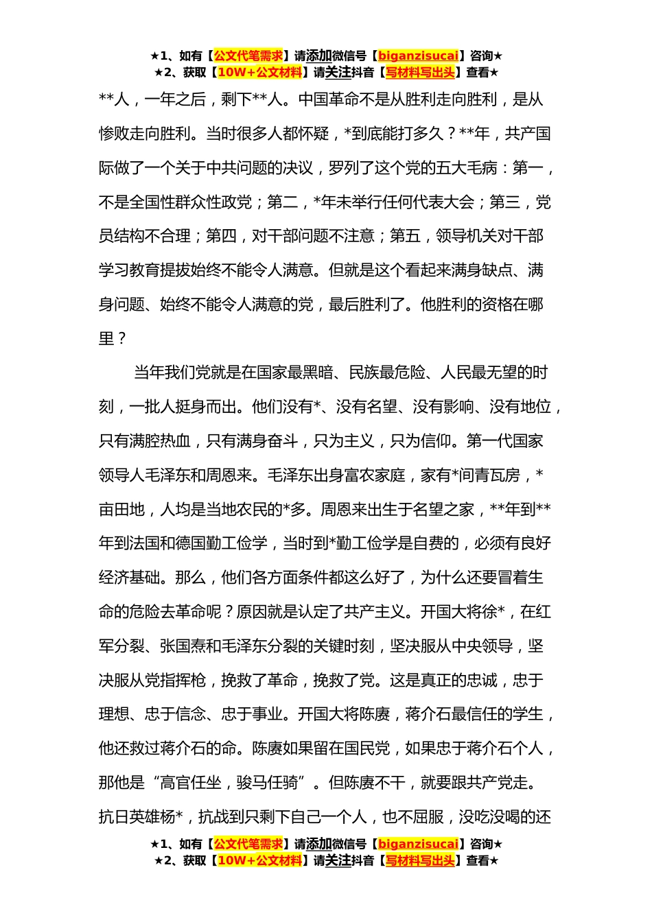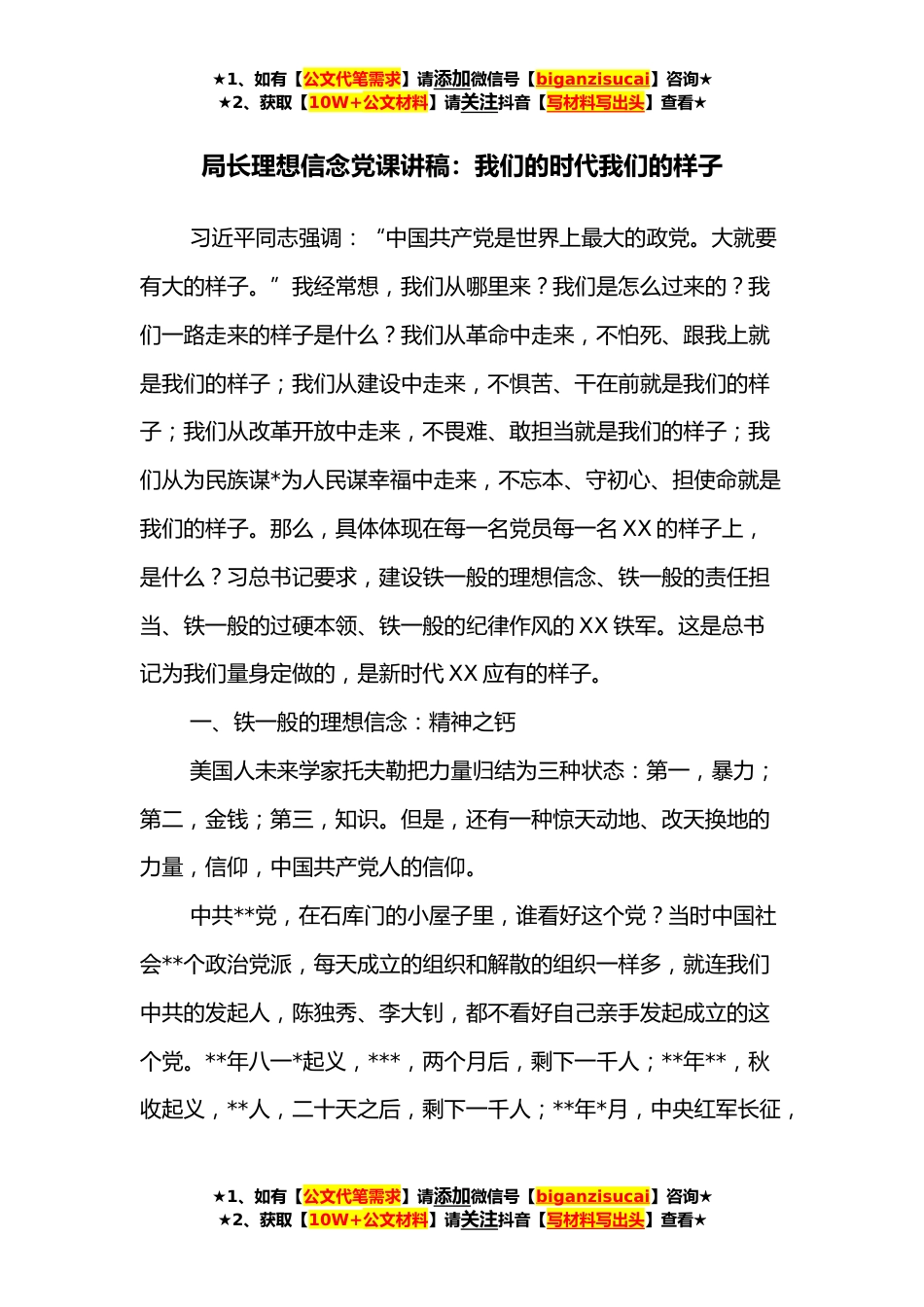 ★1、如有【公文代笔需求】请添加微信号【biganzisucai】咨询★★2、获取【10W+公文材料】请关注抖音【写材料写出头】查看★局长理想信念党课讲稿:我们的时代我们的样子习近平同志强调:“中国共产党是世界上最大的政党。大就要有大的样子。”我经常想,我们从哪里来?我们是怎么过来的?我们一路走来的样子是什么?我们从革命中走来,不怕死、跟我上就是我们的样子;我们从建设中走来,不惧苦、干在前就是我们的样子;我们从改革开放中走来,不畏难、敢担当就是我们的样子;我们从为民族谋*为人民谋幸福中走来,不忘本、守初心、担使命就是我们的样子。那么,具体体现在每一名党员每一名XX的样子上,是什么?习总书记要求,建设铁一般的理想信念、铁一般的责任担当、铁一般的过硬本领、铁一般的纪律作风的XX铁军...