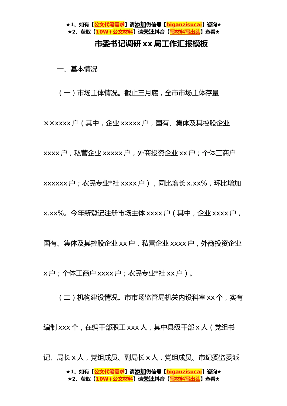 ★1、如有【公文代笔需求】请添加微信号【biganzisucai】咨询★★2、获取【10W+公文材料】请关注抖音【写材料写出头】查看★市委书记调研xx局工作汇报模板一、基本情况(一)市场主体情况。截止三月底,全市市场主体存量××xxxx户(其中,企业xxxxx户,国有、集体及其控股企业xxxx户,私营企业xxxxx户,外商投资企业xx户;个体工商户xxxxxx户;农民专业*社xxxx户),同比增长x.xx%,环比增加x.xx%。今年新登记注册市场主体xxxx户(其中,企业xxxx户,国有、集体及其控股企业xx户,私营企业xxxx户,外商投资企业x户;个体工商户xxxx户;农民专业*社xx户)。(二)机构建设情况。市市场监管局机关内设科室xx个,实有编制xxx个,在编干部职工xxx人,其中县级干部x人(党组书记、局长x人,党组成员、副局长x人,党组...
