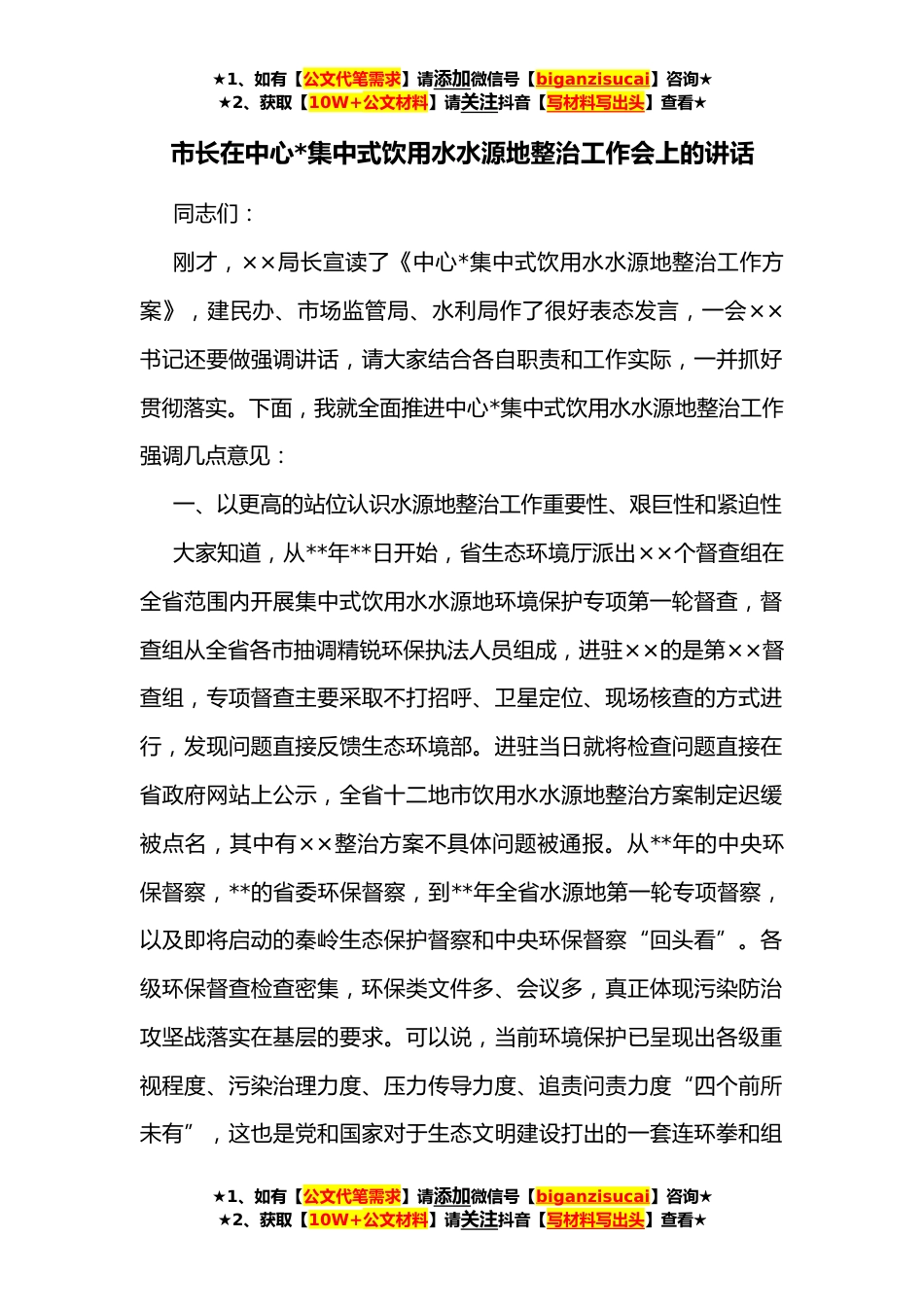 ★1、如有【公文代笔需求】请添加微信号【biganzisucai】咨询★★2、获取【10W+公文材料】请关注抖音【写材料写出头】查看★市长在中心*集中式饮用水水源地整治工作会上的讲话同志们:刚才,××局长宣读了《中心*集中式饮用水水源地整治工作方案》,建民办、市场监管局、水利局作了很好表态发言,一会××书记还要做强调讲话,请大家结合各自职责和工作实际,一并抓好贯彻落实。下面,我就全面推进中心*集中式饮用水水源地整治工作强调几点意见:一、以更高的站位认识水源地整治工作重要性、艰巨性和紧迫性大家知道,从**年**日开始,省生态环境厅派出××个督查组在全省范围内开展集中式饮用水水源地环境保护专项第一轮督查,督查组从全省各市抽调精锐环保执法人员组成,进驻××的是第××督查组,专项督查主要...