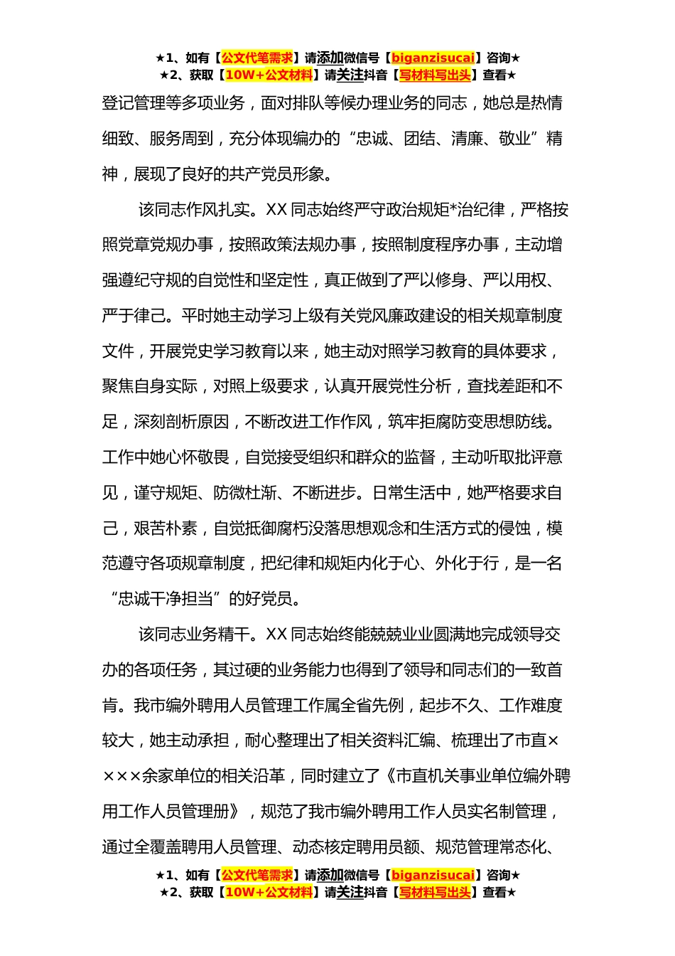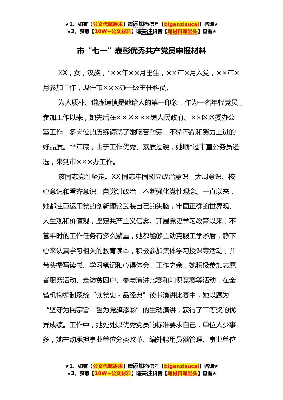 ★1、如有【公文代笔需求】请添加微信号【biganzisucai】咨询★★2、获取【10W+公文材料】请关注抖音【写材料写出头】查看★市“七一”表彰优秀共产党员申报材料XX,女,汉族,*××年××月出生,××年×月入党,××年×月参加工作,现任市×××办一级主任科员。为人质朴、谦虚谨慎是她给人的第一印象,作为一名年轻党员,参加工作以来,她先后在××区×××镇人民政府、××区区委办公室工作,多岗位的历练铸就了她吃苦耐劳、不骄不躁和努力上进的好品质。**年底,由于工作优秀、素质过硬,她顺*过市直公务员遴选,来到市×××办工作。该同志党性坚定。XX同志牢固树立政治意识、大局意识、核心意识和看齐意识,自觉讲政治,不断强化党性观念。一直以来,她都注重运用党的创新理论武装自己的头脑,牢固正确...