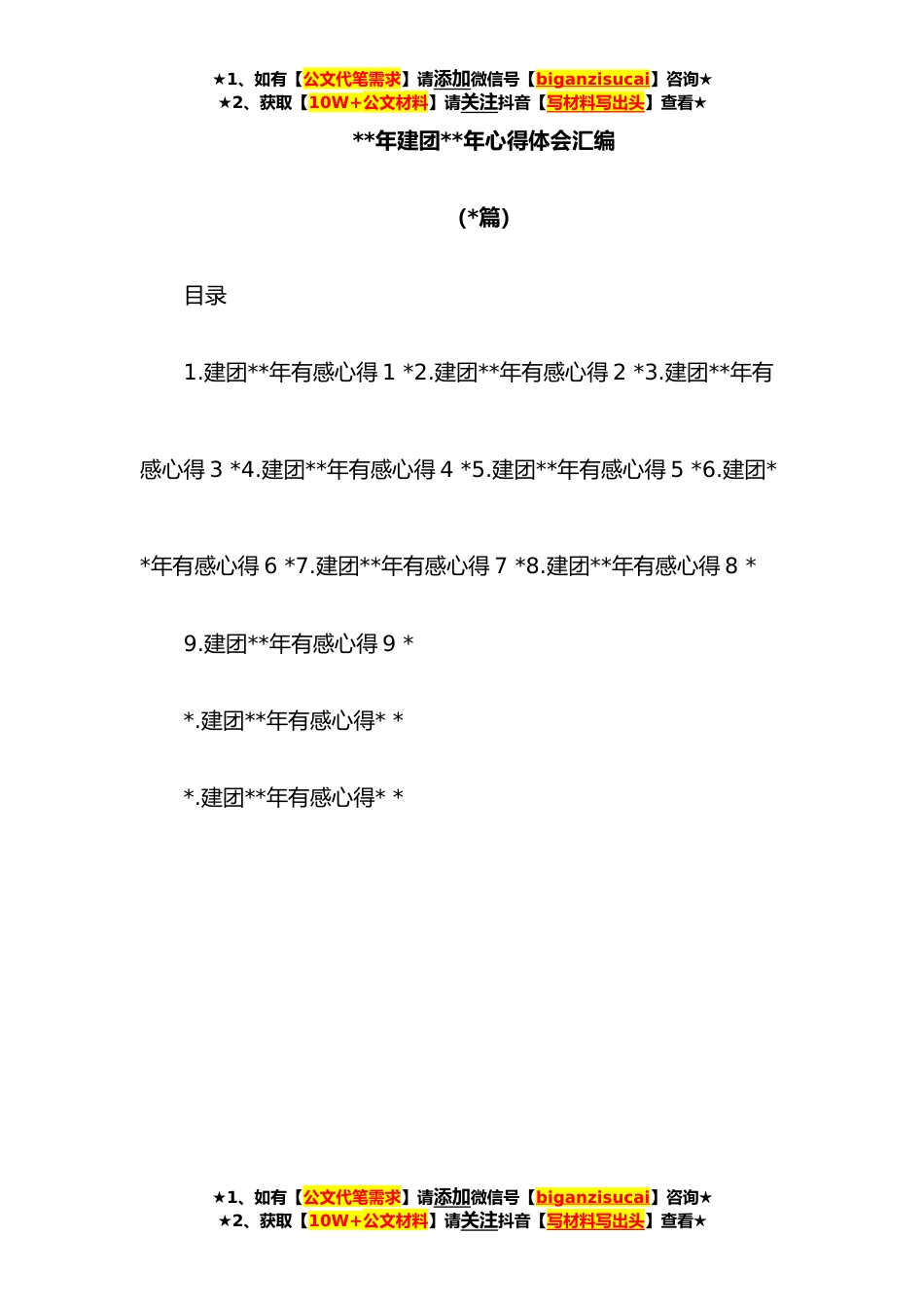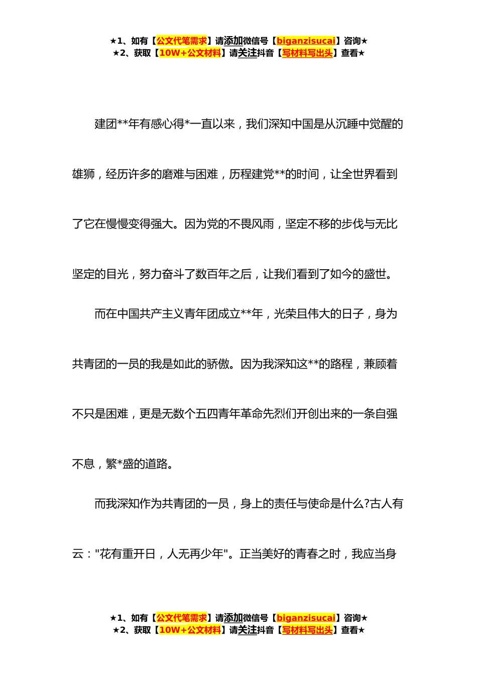 ★1、如有【公文代笔需求】请添加微信号【biganzisucai】咨询★★2、获取【10W+公文材料】请关注抖音【写材料写出头】查看★**年建团**年心得体会汇编(*篇)目录1.建团**年有感心得1*2.建团**年有感心得2*3.建团**年有感心得3*4.建团**年有感心得4*5.建团**年有感心得5*6.建团**年有感心得6*7.建团**年有感心得7*8.建团**年有感心得8*9.建团**年有感心得9**.建团**年有感心得***.建团**年有感心得**★1、如有【公文代笔需求】请添加微信号【biganzisucai】咨询★★2、获取【10W+公文材料】请关注抖音【写材料写出头】查看★★1、如有【公文代笔需求】请添加微信号【biganzisucai】咨询★★2、获取【10W+公文材料】请关注抖音【写材料写出头】查看★建团**年有感心得*一直以来,我们深知中国是从沉睡中觉醒的雄狮...