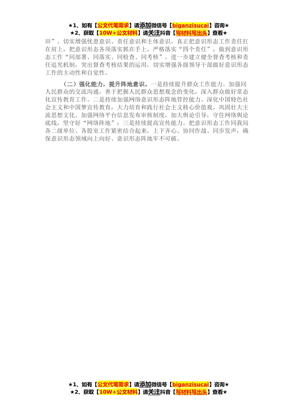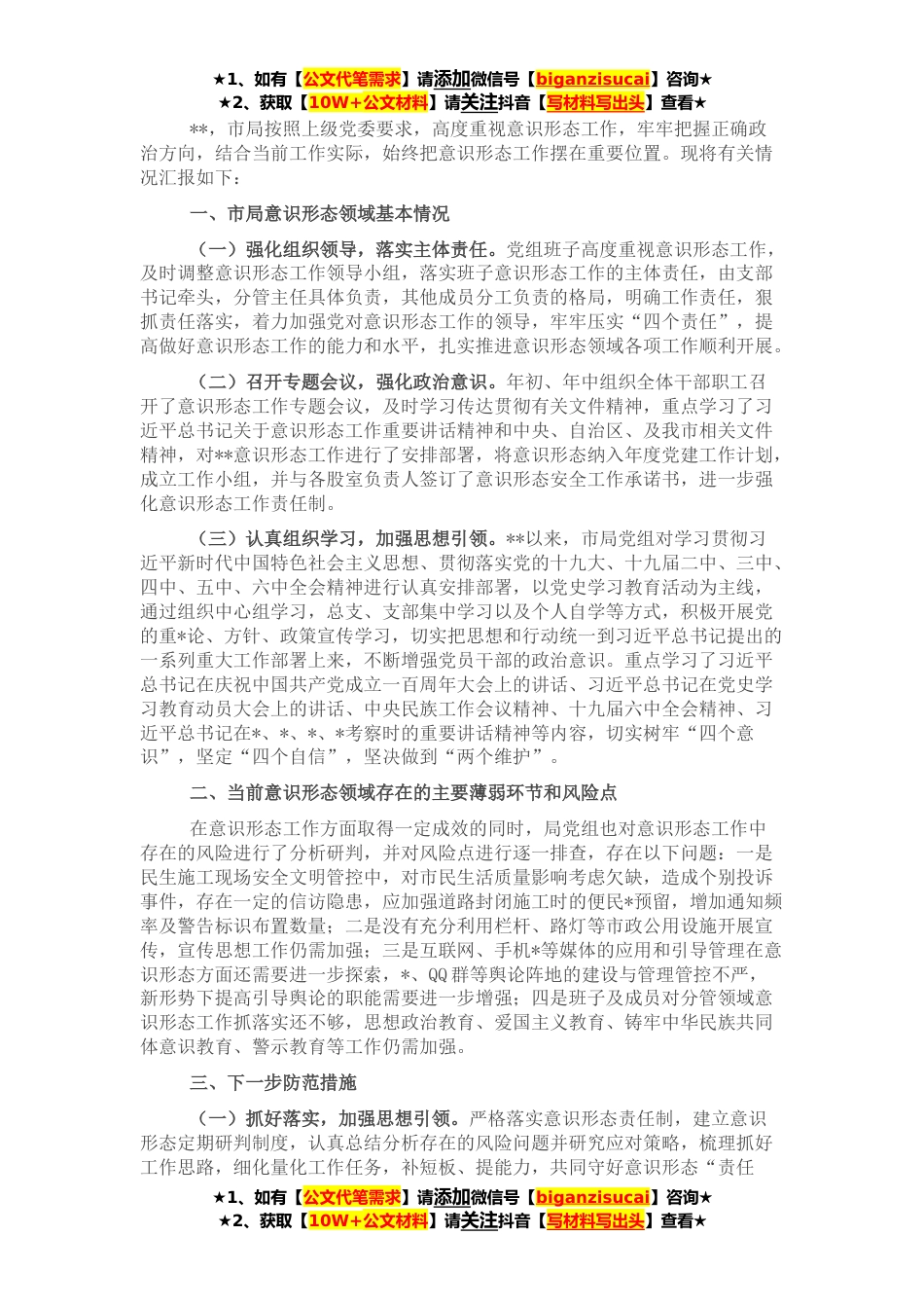 ★1、如有【公文代笔需求】请添加微信号【biganzisucai】咨询★★2、获取【10W+公文材料】请关注抖音【写材料写出头】查看★**,市局按照上级党委要求,高度重视意识形态工作,牢牢把握正确政治方向,结合当前工作实际,始终把意识形态工作摆在重要位置。现将有关情况汇报如下:一、市局意识形态领域基本情况(一)强化组织领导,落实主体责任。党组班子高度重视意识形态工作,及时调整意识形态工作领导小组,落实班子意识形态工作的主体责任,由支部书记牵头,分管主任具体负责,其他成员分工负责的格局,明确工作责任,狠抓责任落实,着力加强党对意识形态工作的领导,牢牢压实“四个责任”,提高做好意识形态工作的能力和水平,扎实推进意识形态领域各项工作顺利开展。(二)召开专题会议,强化政治意识。年初...