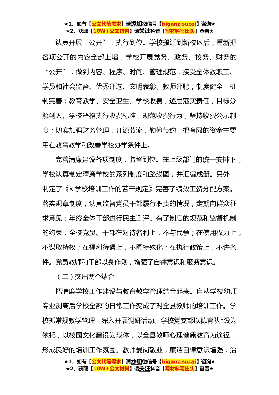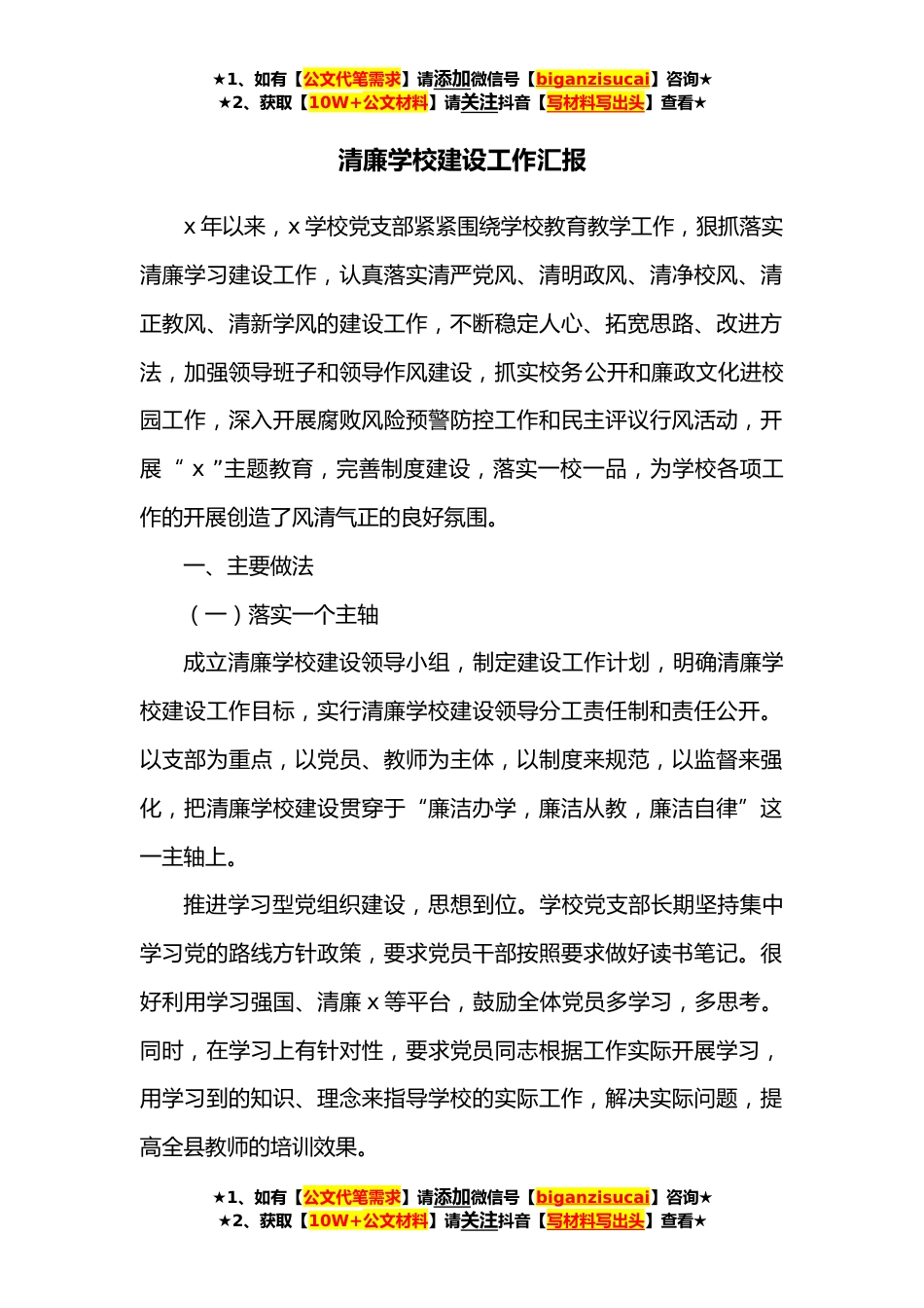 ★1、如有【公文代笔需求】请添加微信号【biganzisucai】咨询★★2、获取【10W+公文材料】请关注抖音【写材料写出头】查看★清廉学校建设工作汇报x年以来,x学校党支部紧紧围绕学校教育教学工作,狠抓落实清廉学习建设工作,认真落实清严党风、清明政风、清净校风、清正教风、清新学风的建设工作,不断稳定人心、拓宽思路、改进方法,加强领导班子和领导作风建设,抓实校务公开和廉政文化进校园工作,深入开展腐败风险预警防控工作和民主评议行风活动,开展“x”主题教育,完善制度建设,落实一校一品,为学校各项工作的开展创造了风清气正的良好氛围。一、主要做法(一)落实一个主轴成立清廉学校建设领导小组,制定建设工作计划,明确清廉学校建设工作目标,实行清廉学校建设领导分工责任制和责任公开。以支部为...