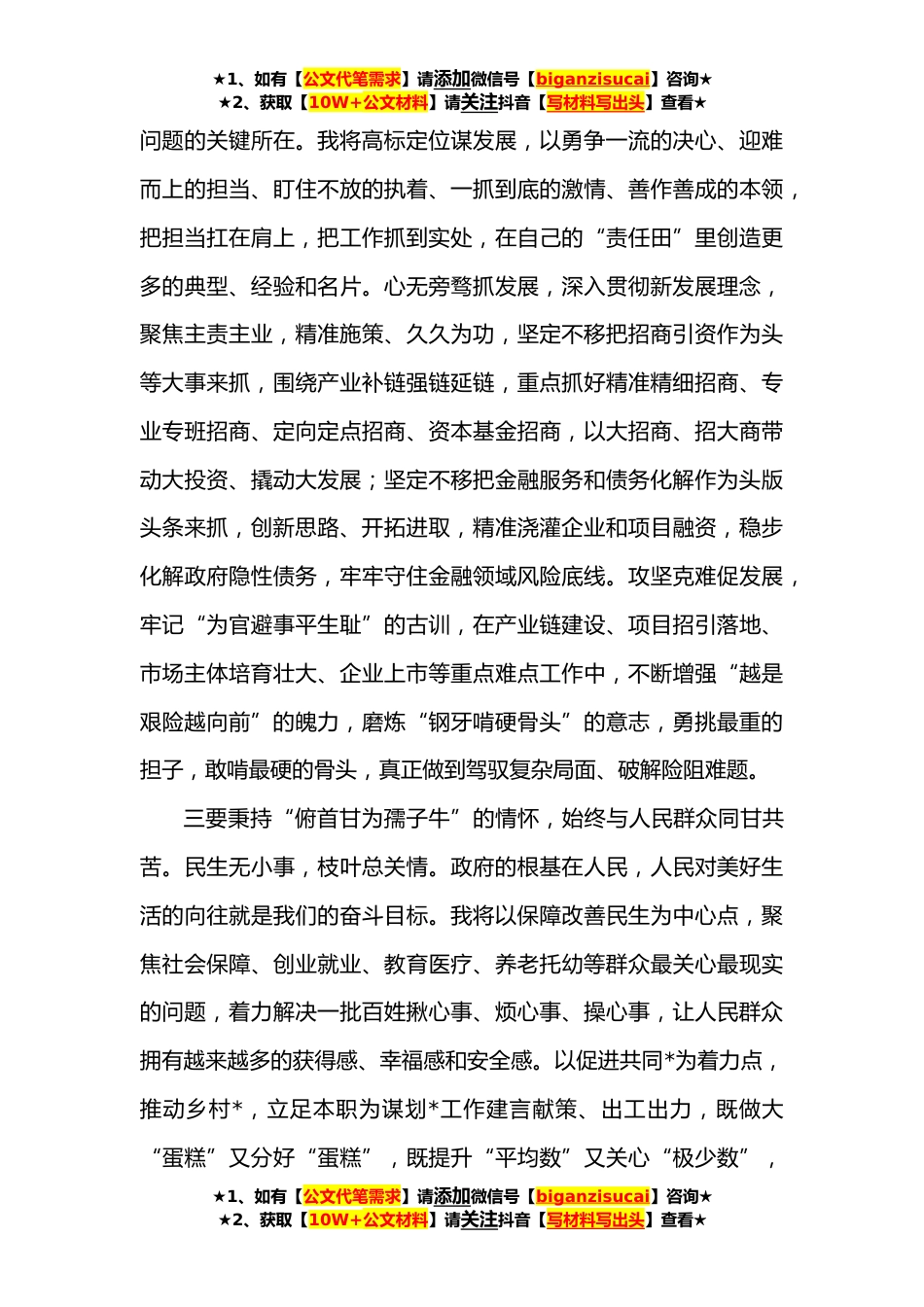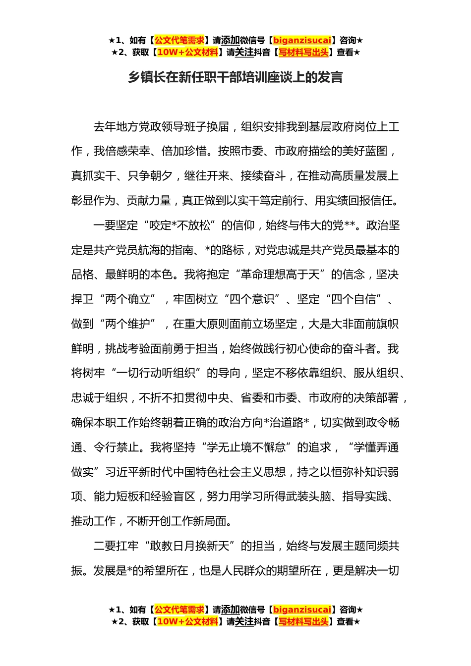 ★1、如有【公文代笔需求】请添加微信号【biganzisucai】咨询★★2、获取【10W+公文材料】请关注抖音【写材料写出头】查看★乡镇长在新任职干部培训座谈上的发言去年地方党政领导班子换届,组织安排我到基层政府岗位上工作,我倍感荣幸、倍加珍惜。按照市委、市政府描绘的美好蓝图,真抓实干、只争朝夕,继往开来、接续奋斗,在推动高质量发展上彰显作为、贡献力量,真正做到以实干笃定前行、用实绩回报信任。一要坚定“咬定*不放松”的信仰,始终与伟大的党**。政治坚定是共产党员航海的指南、*的路标,对党忠诚是共产党员最基本的品格、最鲜明的本色。我将抱定“革命理想高于天”的信念,坚决捍卫“两个确立”,牢固树立“四个意识”、坚定“四个自信”、做到“两个维护”,在重大原则面前立场坚定,大是大非面...