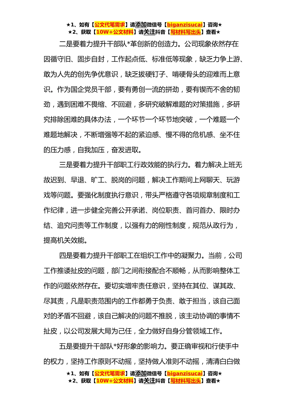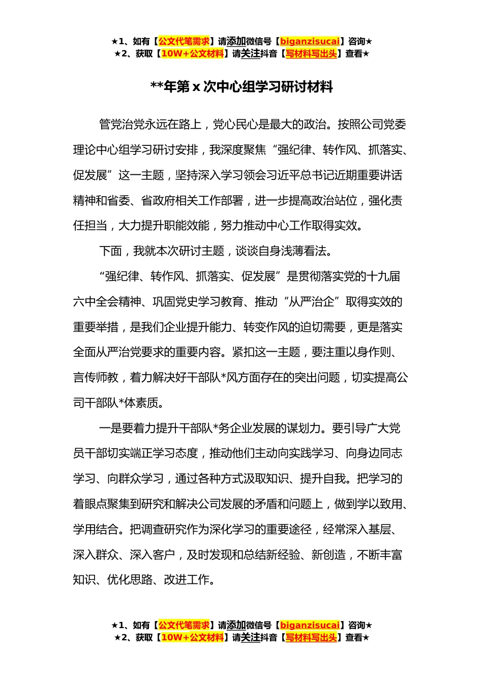 ★1、如有【公文代笔需求】请添加微信号【biganzisucai】咨询★★2、获取【10W+公文材料】请关注抖音【写材料写出头】查看★**年第x次中心组学习研讨材料管党治党永远在路上,党心民心是最大的政治。按照公司党委理论中心组学习研讨安排,我深度聚焦“强纪律、转作风、抓落实、促发展”这一主题,坚持深入学习领会习近平总书记近期重要讲话精神和省委、省政府相关工作部署,进一步提高政治站位,强化责任担当,大力提升职能效能,努力推动中心工作取得实效。下面,我就本次研讨主题,谈谈自身浅薄看法。“强纪律、转作风、抓落实、促发展”是贯彻落实党的十九届六中全会精神、巩固党史学习教育、推动“从严治企”取得实效的重要举措,是我们企业提升能力、转变作风的迫切需要,更是落实全面从严治党要求的重要内容...