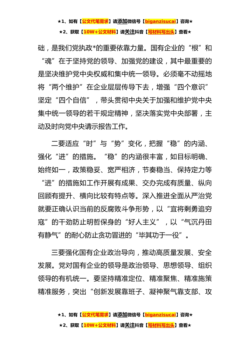 ★1、如有【公文代笔需求】请添加微信号【biganzisucai】咨询★★2、获取【10W+公文材料】请关注抖音【写材料写出头】查看★公司党委书记在公司全面从严治党推进会议讲话同志们:习近平总书记在十九届中央纪委六次全会上强调,要以新时代中国特色社会主义思想为指导,增强“四个意识”、坚定“四个自信”、做到“两个维护”,以党的政治建设为统领全面推进党的建设,取得全面从严治党更大战略性成果,巩固发展反腐败斗争压倒性胜利,一体推进不敢腐、不能腐、不想腐。×公司作为实施XX项目的主体,始终把全面从严治党贯穿×事业全过程,坚决贯彻执行党的路线方针政策和国有企业改革发展的决策部署,以党建为引领,推动企业高质量发展、安全发展。一、提高政治站位,加强党的政治建设全面从严治党向纵深发展,必须...