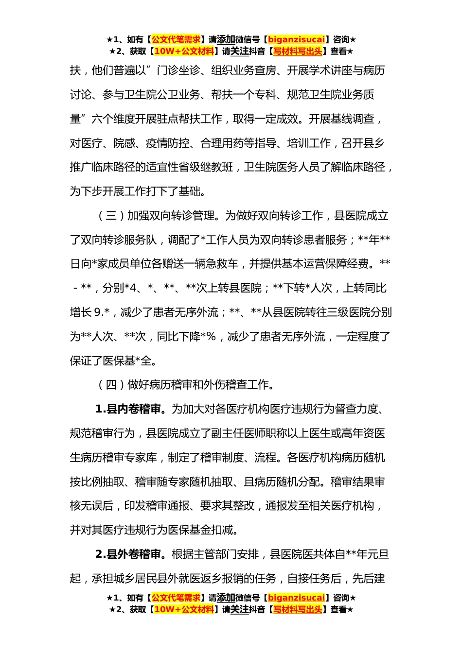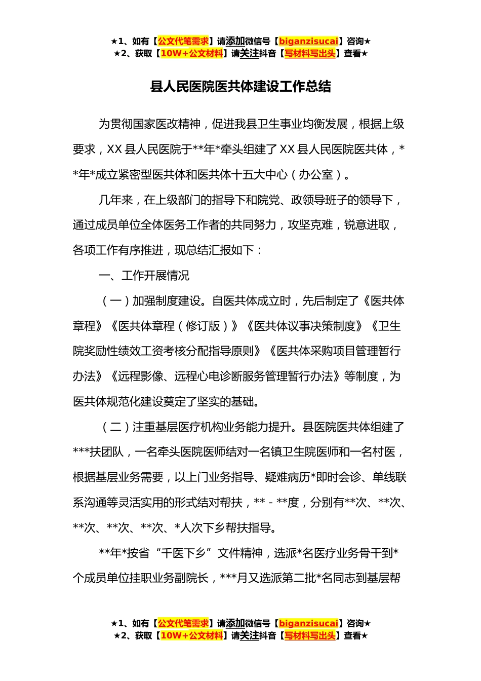 ★1、如有【公文代笔需求】请添加微信号【biganzisucai】咨询★★2、获取【10W+公文材料】请关注抖音【写材料写出头】查看★县人民医院医共体建设工作总结为贯彻国家医改精神,促进我县卫生事业均衡发展,根据上级要求,XX县人民医院于**年*牵头组建了XX县人民医院医共体,**年*成立紧密型医共体和医共体十五大中心(办公室)。几年来,在上级部门的指导下和院党、政领导班子的领导下,通过成员单位全体医务工作者的共同努力,攻坚克难,锐意进取,各项工作有序推进,现总结汇报如下:一、工作开展情况(一)加强制度建设。自医共体成立时,先后制定了《医共体章程》《医共体章程(修订版)》《医共体议事决策制度》《卫生院奖励性绩效工资考核分配指导原则》《医共体采购项目管理暂行办法》《远程影像、远程心电...