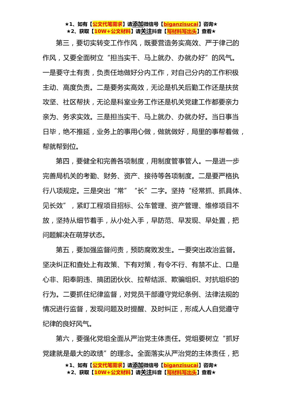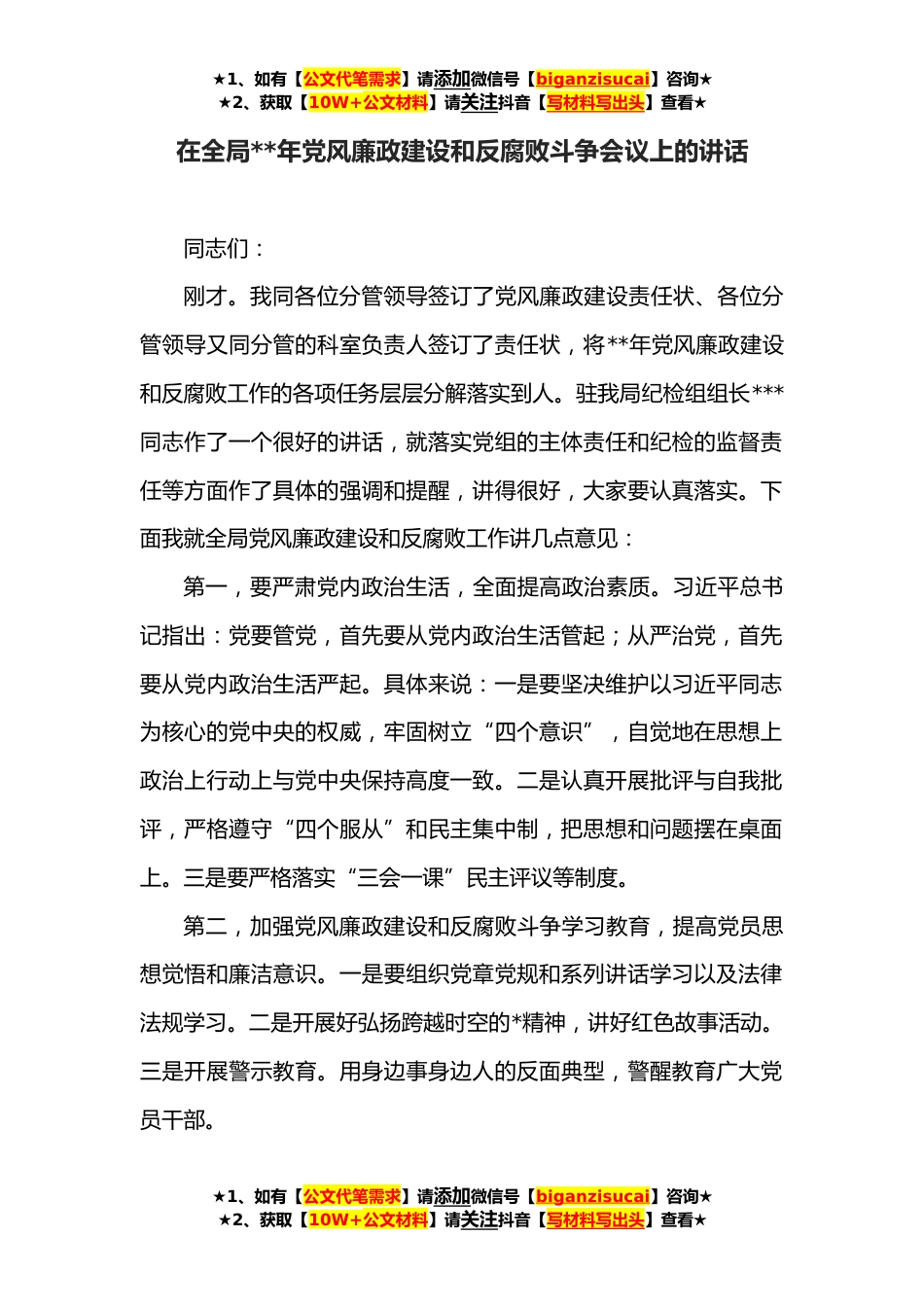 ★1、如有【公文代笔需求】请添加微信号【biganzisucai】咨询★★2、获取【10W+公文材料】请关注抖音【写材料写出头】查看★在全局**年党风廉政建设和反腐败斗争会议上的讲话同志们:刚才。我同各位分管领导签订了党风廉政建设责任状、各位分管领导又同分管的科室负责人签订了责任状,将**年党风廉政建设和反腐败工作的各项任务层层分解落实到人。驻我局纪检组组长***同志作了一个很好的讲话,就落实党组的主体责任和纪检的监督责任等方面作了具体的强调和提醒,讲得很好,大家要认真落实。下面我就全局党风廉政建设和反腐败工作讲几点意见:第一,要严肃党内政治生活,全面提高政治素质。习近平总书记指出:党要管党,首先要从党内政治生活管起;从严治党,首先要从党内政治生活严起。具体来说:一是要坚决维护以...