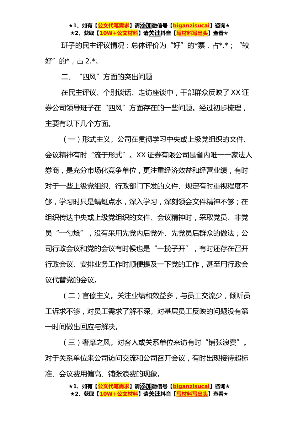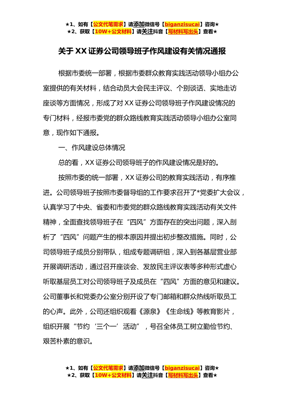 ★1、如有【公文代笔需求】请添加微信号【biganzisucai】咨询★★2、获取【10W+公文材料】请关注抖音【写材料写出头】查看★关于XX证券公司领导班子作风建设有关情况通报根据市委统一部署,根据市委群众教育实践活动领导小组办公室提供的有关材料,结合动员大会民主评议、个别谈话、实地走访座谈等方面情况,形成了对XX证券公司领导班子作风建设情况的专门材料,经报市委党的群众路线教育实践活动领导小组办公室同意,现作如下通报。一、作风建设总体情况总的看,XX证券公司领导班子的作风建设情况是好的。按照市委的统一部署,XX证券公司的教育实践活动,有序推进。公司领导班子按照市委督导组的工作要求召开了*党委扩大会议,认真学习了中央、省委和市委党的群众路线教育实践活动有关文件精神,全面查找领导班子...