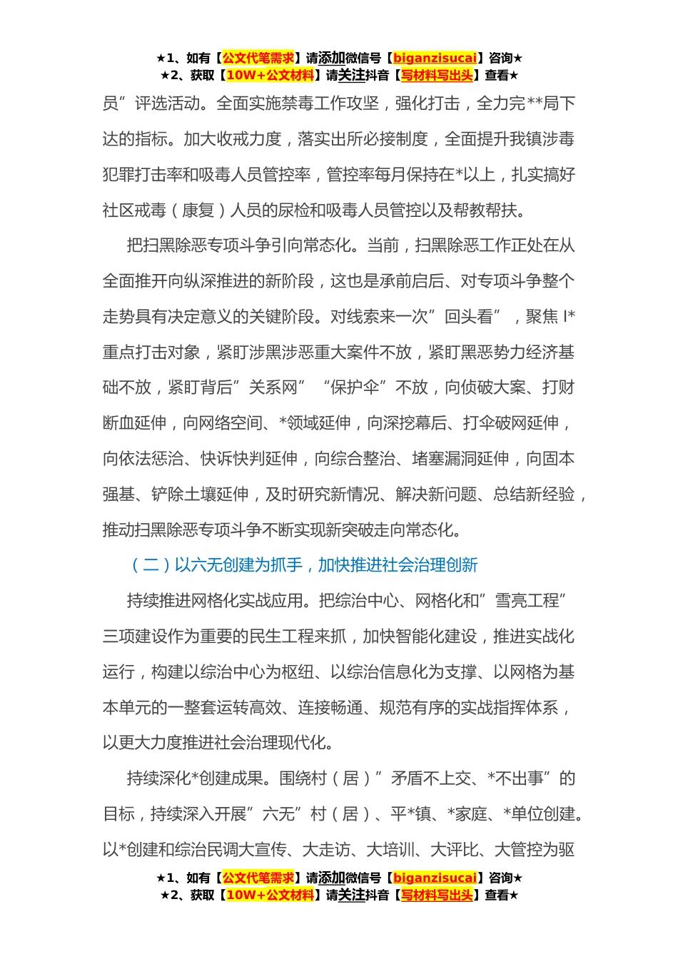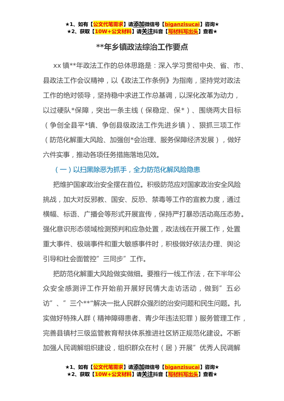 ★1、如有【公文代笔需求】请添加微信号【biganzisucai】咨询★★2、获取【10W+公文材料】请关注抖音【写材料写出头】查看★**年乡镇政法综治工作要点xx镇**年政法工作的总体思路是:深入学习贯彻中央、省、市、县政法工作会议精神,以《政法工作条例》为指南,坚持党对政法工作的绝对领导,坚持稳中求进工作总基调,以深化改革为动力,以过硬队*保障,突出一条主线(保稳定、保*)、围绕两大目标(争创全县平*镇、争创县级政法工作先进乡镇)、狠抓三项工作(防范化解重大风险、加强创*会治理、服务保障经济发展),做好六件实事,推动各项任务措施落地见效。(一)以扫黑除恶为抓手,全力防范化解风险隐患把维护国家政治安全摆在首位。积极防范应对国家政治安全风险挑战,加大对反邪教、国安、反恐、禁毒等工作...
