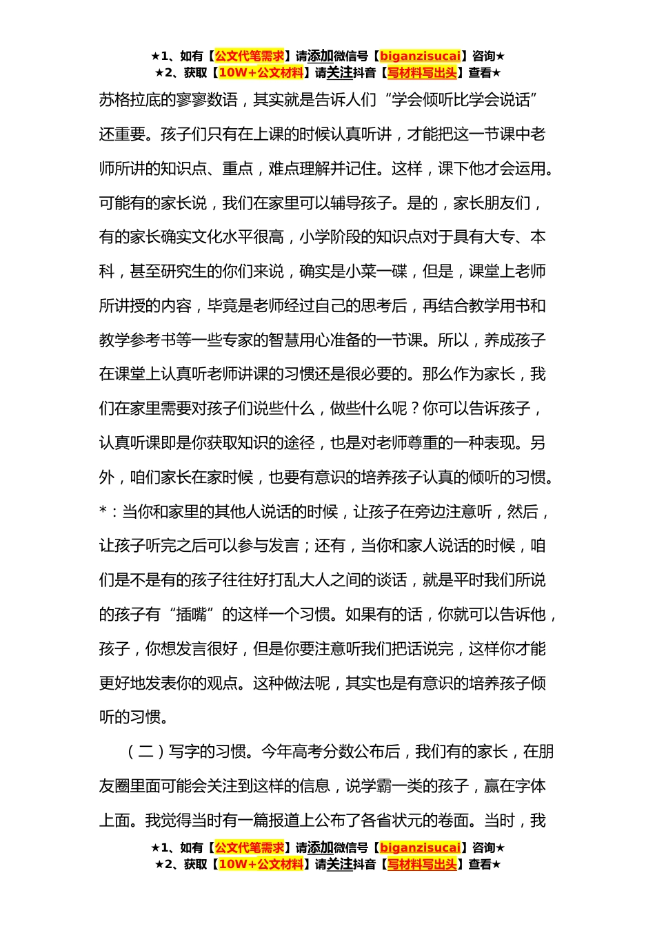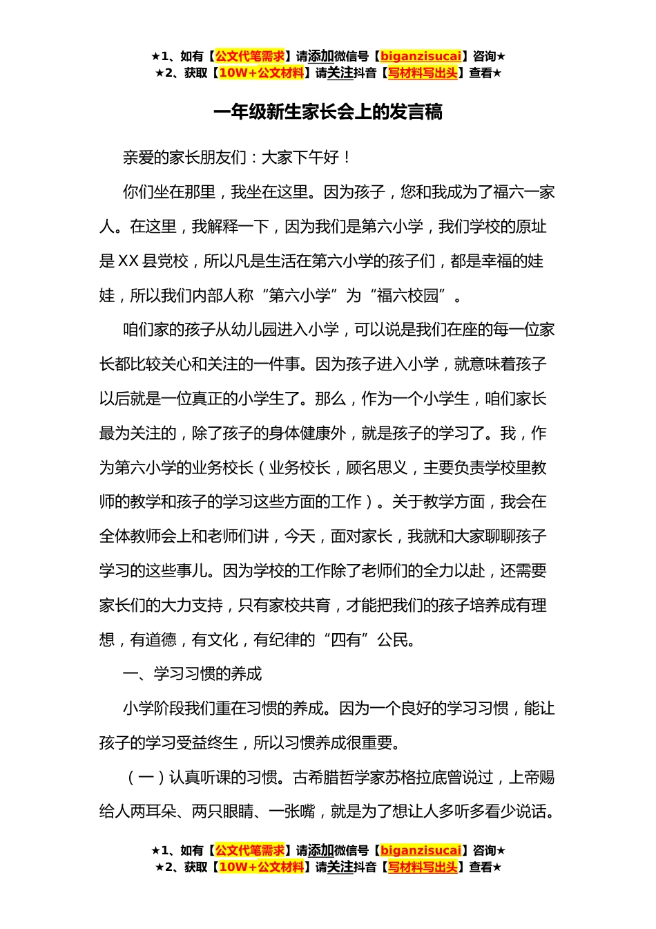 ★1、如有【公文代笔需求】请添加微信号【biganzisucai】咨询★★2、获取【10W+公文材料】请关注抖音【写材料写出头】查看★一年级新生家长会上的发言稿亲爱的家长朋友们:大家下午好!你们坐在那里,我坐在这里。因为孩子,您和我成为了福六一家人。在这里,我解释一下,因为我们是第六小学,我们学校的原址是XX县党校,所以凡是生活在第六小学的孩子们,都是幸福的娃娃,所以我们内部人称“第六小学”为“福六校园”。咱们家的孩子从幼儿园进入小学,可以说是我们在座的每一位家长都比较关心和关注的一件事。因为孩子进入小学,就意味着孩子以后就是一位真正的小学生了。那么,作为一个小学生,咱们家长最为关注的,除了孩子的身体健康外,就是孩子的学习了。我,作为第六小学的业务校长(业务校长,顾名思义,...