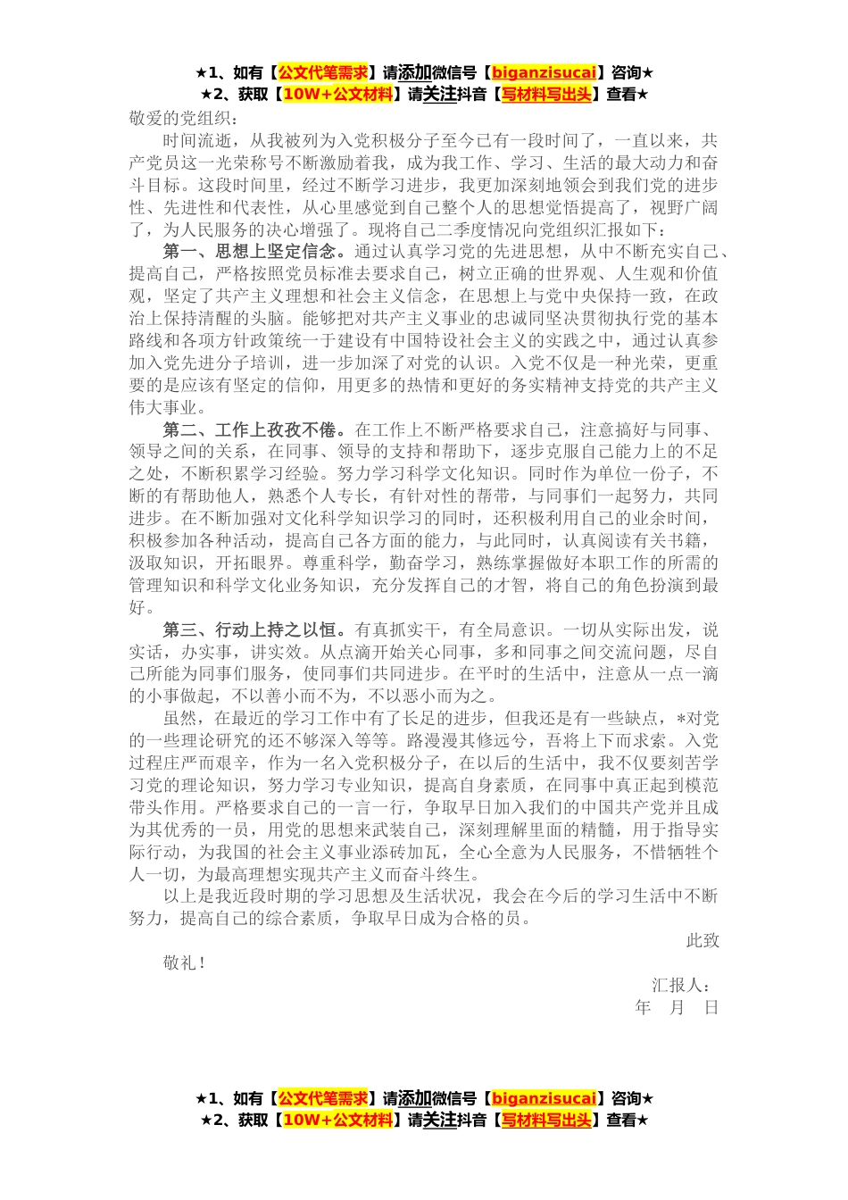 ★1、如有【公文代笔需求】请添加微信号【biganzisucai】咨询★★2、获取【10W+公文材料】请关注抖音【写材料写出头】查看★敬爱的党组织:时间流逝,从我被列为入党积极分子至今已有一段时间了,一直以来,共产党员这一光荣称号不断激励着我,成为我工作、学习、生活的最大动力和奋斗目标。这段时间里,经过不断学习进步,我更加深刻地领会到我们党的进步性、先进性和代表性,从心里感觉到自己整个人的思想觉悟提高了,视野广阔了,为人民服务的决心增强了。现将自己二季度情况向党组织汇报如下:第一、思想上坚定信念。通过认真学习党的先进思想,从中不断充实自己、提高自己,严格按照党员标准去要求自己,树立正确的世界观、人生观和价值观,坚定了共产主义理想和社会主义信念,在思想上与党中央保持一致,在...