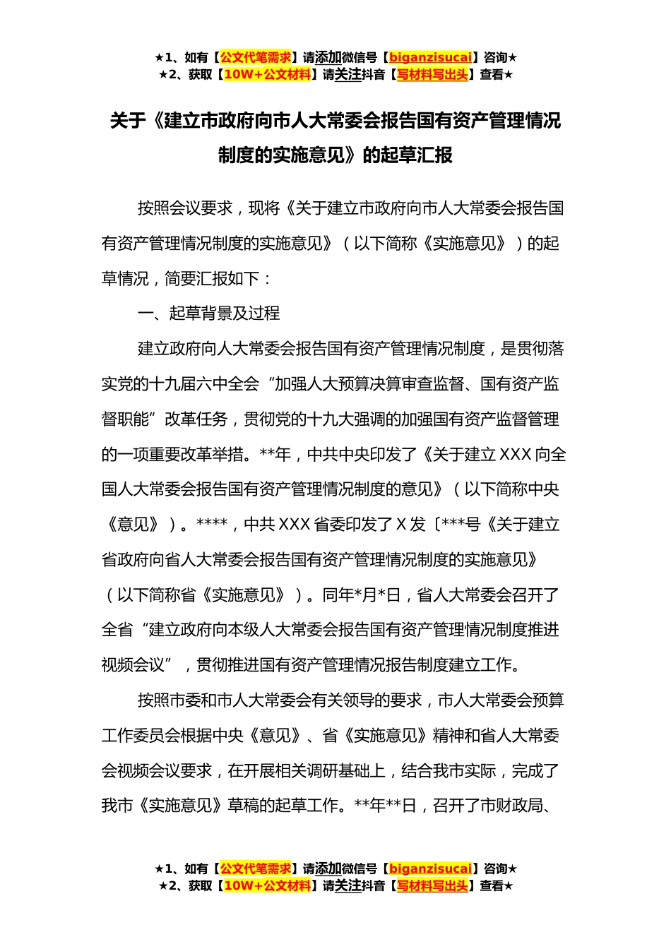 ★1、如有【公文代笔需求】请添加微信号【biganzisucai】咨询★★2、获取【10W+公文材料】请关注抖音【写材料写出头】查看★关于《建立市政府向市人大常委会报告国有资产管理情况制度的实施意见》的起草汇报按照会议要求,现将《关于建立市政府向市人大常委会报告国有资产管理情况制度的实施意见》(以下简称《实施意见》)的起草情况,简要汇报如下:一、起草背景及过程建立政府向人大常委会报告国有资产管理情况制度,是贯彻落实党的十九届六中全会“加强人大预算决算审查监督、国有资产监督职能”改革任务,贯彻党的十九大强调的加强国有资产监督管理的一项重要改革举措。**年,中共中央印发了《关于建立XXX向全国人大常委会报告国有资产管理情况制度的意见》(以下简称中央《意见》)。****,中共XXX省委印发...