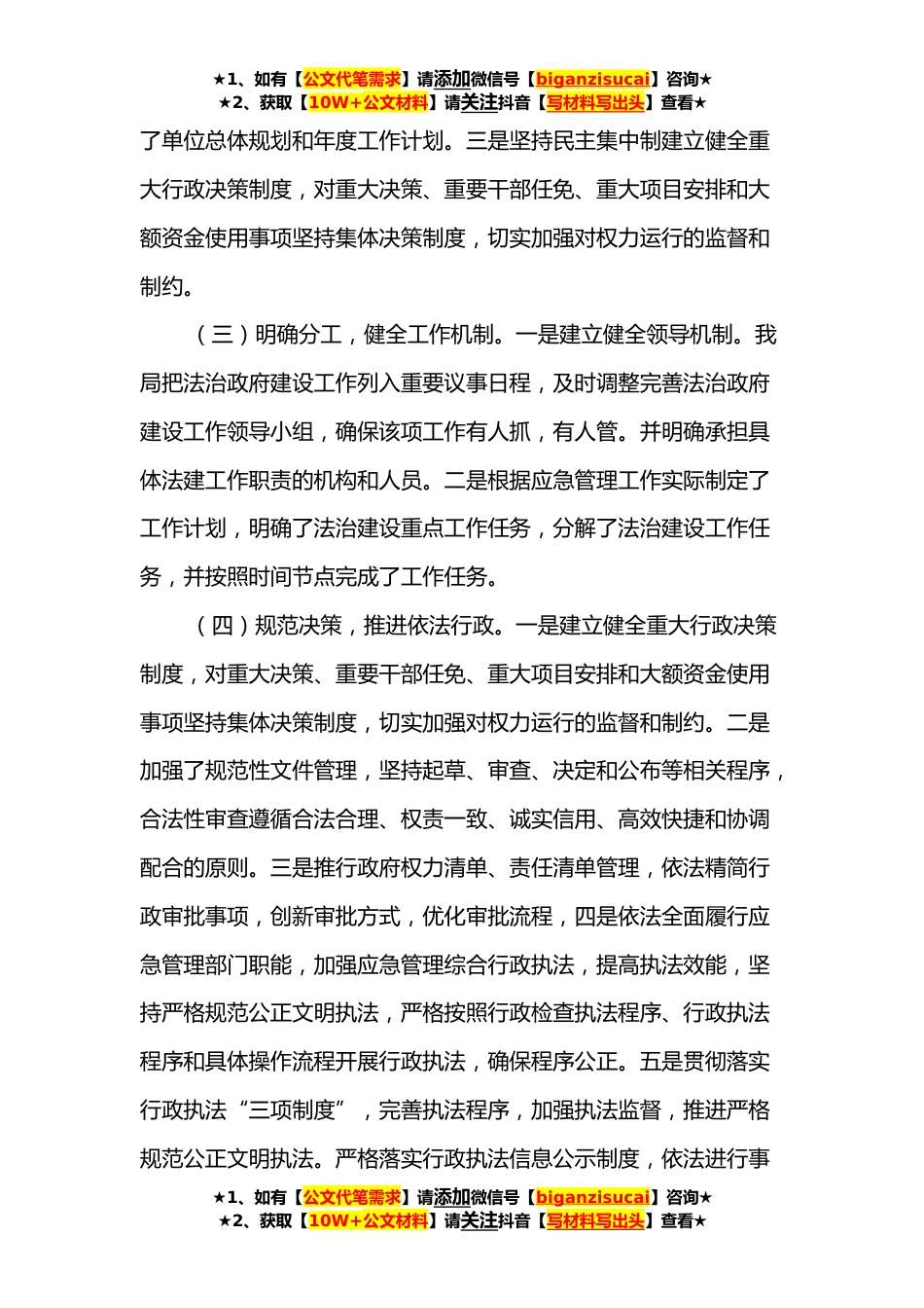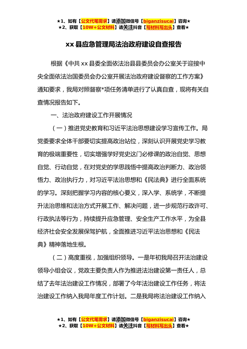 ★1、如有【公文代笔需求】请添加微信号【biganzisucai】咨询★★2、获取【10W+公文材料】请关注抖音【写材料写出头】查看★xx县应急管理局法治政府建设自查报告根据《中共xx县委全面依法治县县委员会办公室关于迎接中央全面依法治国委员会办公室开展法治政府建设督察的工作方案》通知要求,我局对照督察*项任务清单进行了认真自查,现将有关自查情况报告如下。一、法治政府建设工作开展情况(一)推进党史教育和习近平法治思想建设学习宣传工作。局党委要求全体干部要切实提高政治站位,深刻认识开展党史学习教育的极端重要性,切实增强学好党史这门必修课的政治自觉、思想自觉、行动自觉,在对党史的学思践悟中提高政治判断力、政治领悟力、政治执行力,对习近平法治思想和《民法典》进行全面系统的学习。深刻把...