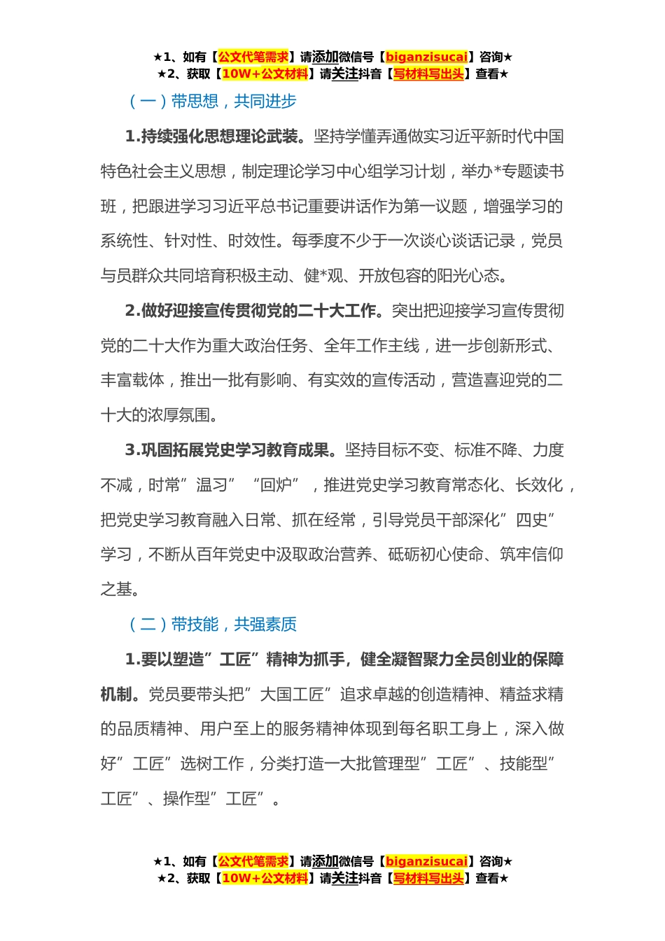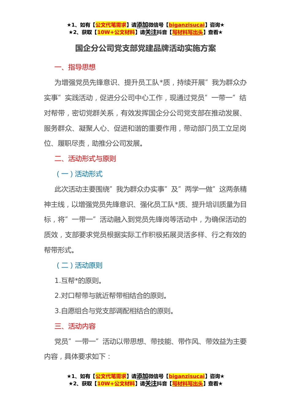 ★1、如有【公文代笔需求】请添加微信号【biganzisucai】咨询★★2、获取【10W+公文材料】请关注抖音【写材料写出头】查看★国企分公司党支部党建品牌活动实施方案一、指导思想为增强党员先锋意识、提升员工队*质,持续开展”我为群众办实事”实践活动,促进分公司中心工作,现通过党员”一带一”结对帮带,密切党群关系,有效发挥国企分公司党支部在推动发展、服务群众、凝聚人心、促进和谐的重要作用,带动部门员工立足岗位、履职尽责,助推分公司发展。二、活动形式与原则(一)活动形式此次活动主要围绕”我为群众办实事”及”两学一做”这两条精神主线,以增强党员先锋意识、强化员工队*质、提升培训质量为目标,将”一带一”活动融入到党员先锋岗等活动中,为确保活动的质效,支部要求党员根据实际工作积极...