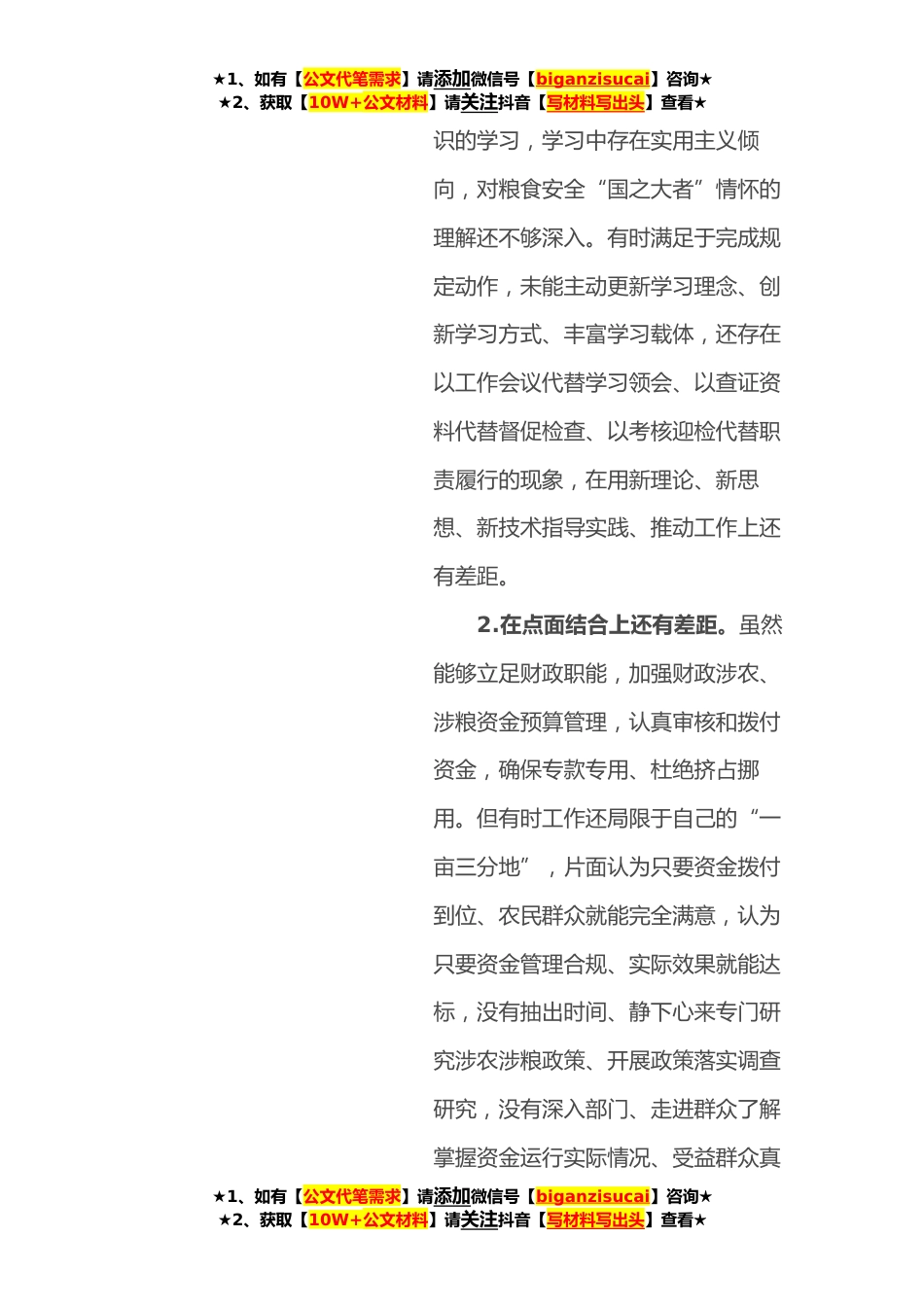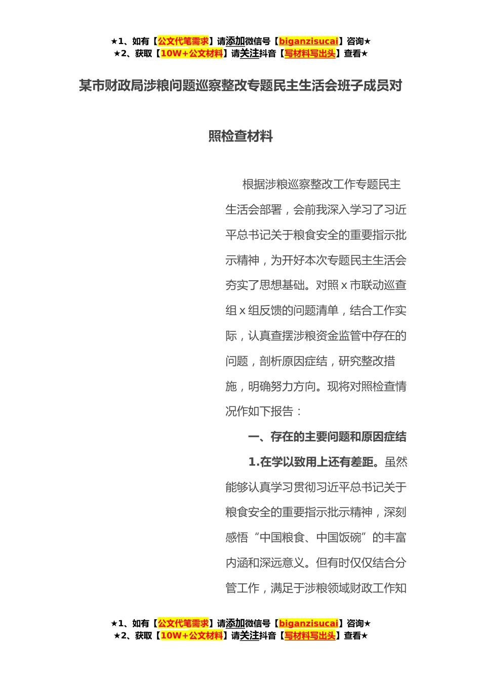★1、如有【公文代笔需求】请添加微信号【biganzisucai】咨询★★2、获取【10W+公文材料】请关注抖音【写材料写出头】查看★某市财政局涉粮问题巡察整改专题民主生活会班子成员对照检查材料根据涉粮巡察整改工作专题民主生活会部署,会前我深入学习了习近平总书记关于粮食安全的重要指示批示精神,为开好本次专题民主生活会夯实了思想基础。对照x市联动巡查组x组反馈的问题清单,结合工作实际,认真查摆涉粮资金监管中存在的问题,剖析原因症结,研究整改措施,明确努力方向。现将对照检查情况作如下报告:一、存在的主要问题和原因症结1.在学以致用上还有差距。虽然能够认真学习贯彻习近平总书记关于粮食安全的重要指示批示精神,深刻感悟“中国粮食、中国饭碗”的丰富内涵和深远意义。但有时仅仅结合分管工作,...