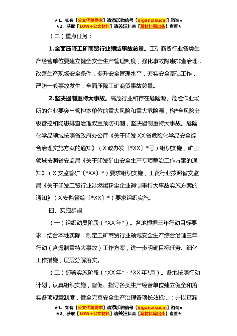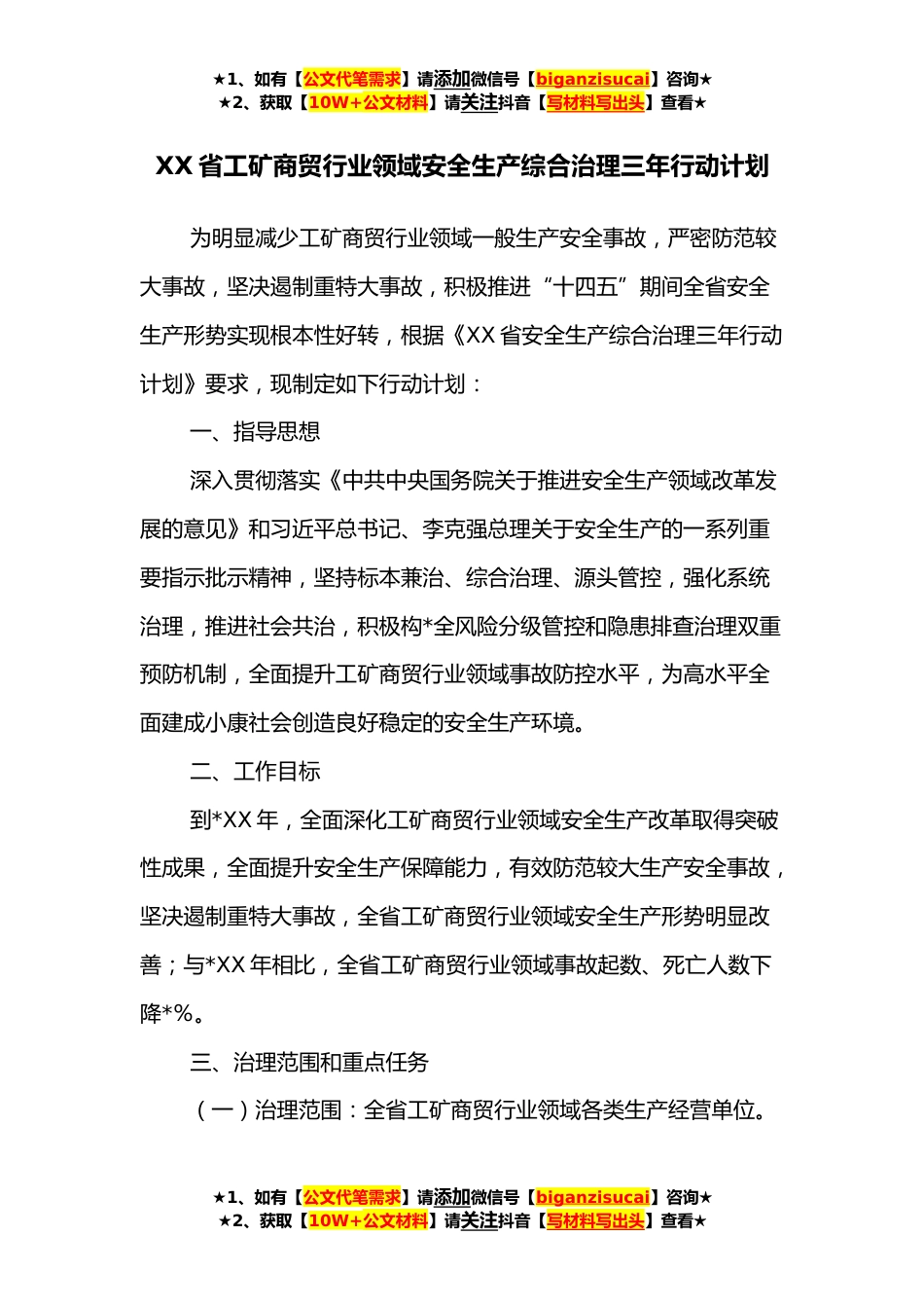 ★1、如有【公文代笔需求】请添加微信号【biganzisucai】咨询★★2、获取【10W+公文材料】请关注抖音【写材料写出头】查看★XX省工矿商贸行业领域安全生产综合治理三年行动计划为明显减少工矿商贸行业领域一般生产安全事故,严密防范较大事故,坚决遏制重特大事故,积极推进“十四五”期间全省安全生产形势实现根本性好转,根据《XX省安全生产综合治理三年行动计划》要求,现制定如下行动计划:一、指导思想深入贯彻落实《中共中央国务院关于推进安全生产领域改革发展的意见》和习近平总书记、李克强总理关于安全生产的一系列重要指示批示精神,坚持标本兼治、综合治理、源头管控,强化系统治理,推进社会共治,积极构*全风险分级管控和隐患排查治理双重预防机制,全面提升工矿商贸行业领域事故防控水平,为高水平...