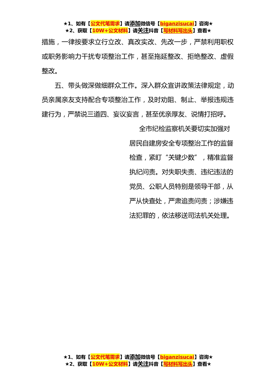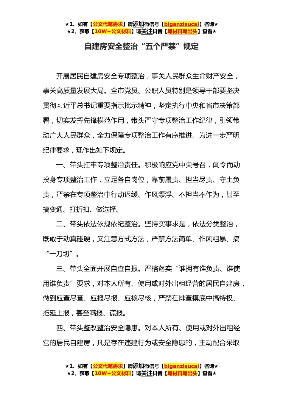★1、如有【公文代笔需求】请添加微信号【biganzisucai】咨询★★2、获取【10W+公文材料】请关注抖音【写材料写出头】查看★自建房安全整治“五个严禁”规定开展居民自建房安全专项整治,事关人民群众生命财产安全,事关高质量发展大局。全市党员、公职人员特别是领导干部要坚决贯彻习近平总书记重要指示批示精神,坚定执行中央和省市决策部署,切实发挥先锋模范作用,带头严守专项整治工作纪律,引领带动广大人民群众,全力保障专项整治工作有序推进。为进一步严明纪律要求,现作出如下规定。一、带头扛牢专项整治责任。积极响应党中央号召,闻令而动投身专项整治工作,立足各自岗位,靠前履责、担当尽责、守土负责,严禁在专项整治中行动迟缓、作风漂浮、不担当不作为,甚至搞变通、打折扣、做选择。二、带头依...