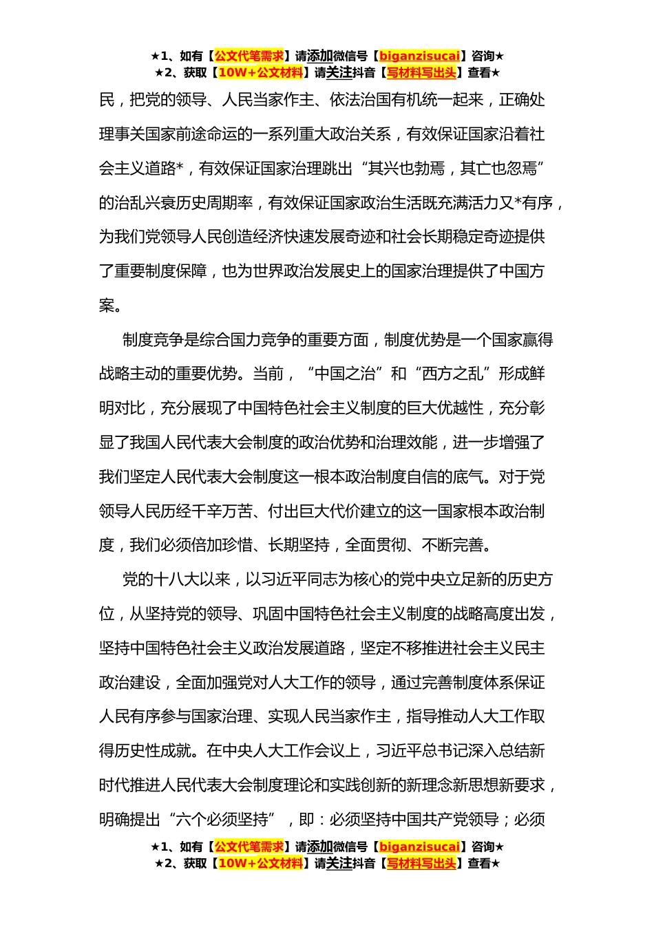 ★1、如有【公文代笔需求】请添加微信号【biganzisucai】咨询★★2、获取【10W+公文材料】请关注抖音【写材料写出头】查看★学习在中央人大工作会议上重要讲话的体会***月*日至*日,党中央召开了中央人大工作会议,这在党的历史上、人民代表大会制度历史上都是第一次,在我国社会主义民主政治建设进程中具有重*程碑意义。习近平总书记在会上发表重要讲话,全面总结我国人民代表大会制度的发展历程,深刻回答新时代发展中国特色社会主义民主政治、坚持和完善人民代表大会制度的一系列重*论和实践问题,系统阐述全过程人民民主的重*念,明确提出了做好人大工作的重大原则、思路举措、重点任务,为新时代坚持和完善人民代表大会制度、加强和改进人大工作提供了科学指引和行动指南。我们要认真学习、全面贯彻习近平总...