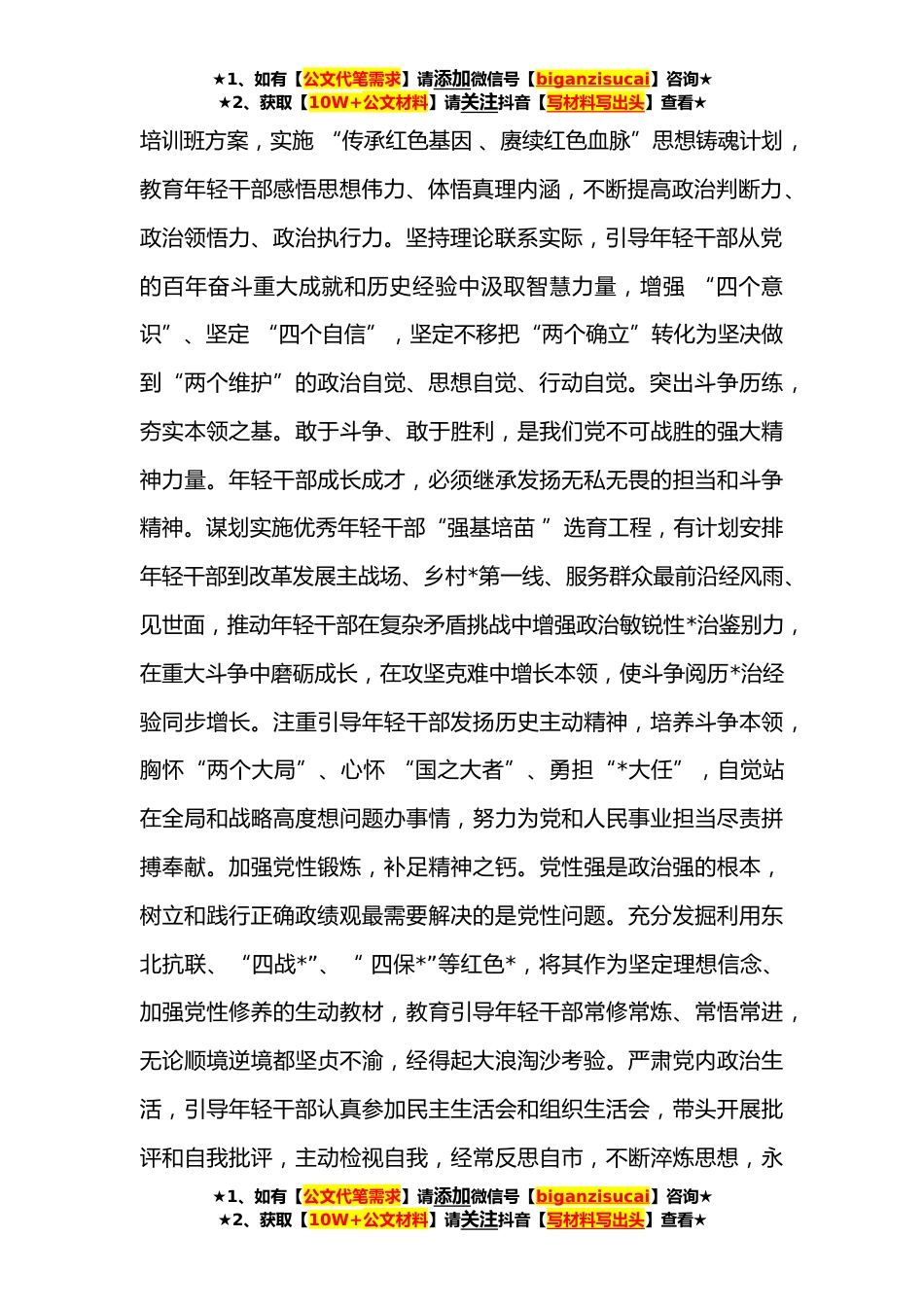 ★1、如有【公文代笔需求】请添加微信号【biganzisucai】咨询★★2、获取【10W+公文材料】请关注抖音【写材料写出头】查看★在组织部机关年轻干部座谈会上的讲话同志们:习近平总书记对年轻干部工作高度重视、始终牵挂于心,作出一系列重要论述和重要指示,为年轻干部健康成长提供了思想指引和行动指南。特别是在今年春季学期中央党校(国家行政学院)中青年干部培训班开班式上,习近平总书记突出强调年轻干部必须筑牢理想信念根基,树立践行正确政绩观,在新时代新征程上留下无悔的奋斗足迹。年轻干部是党和国家事业发展的希望,组织部门必须坚决扛起政治责任,从严从实加强教育管理监督,教育引导年轻干部成为党和人民忠诚可靠的干部。一、加强政治历练,在凝心铸魂、履职尽责中提升政治能力习近平总书记强调,...