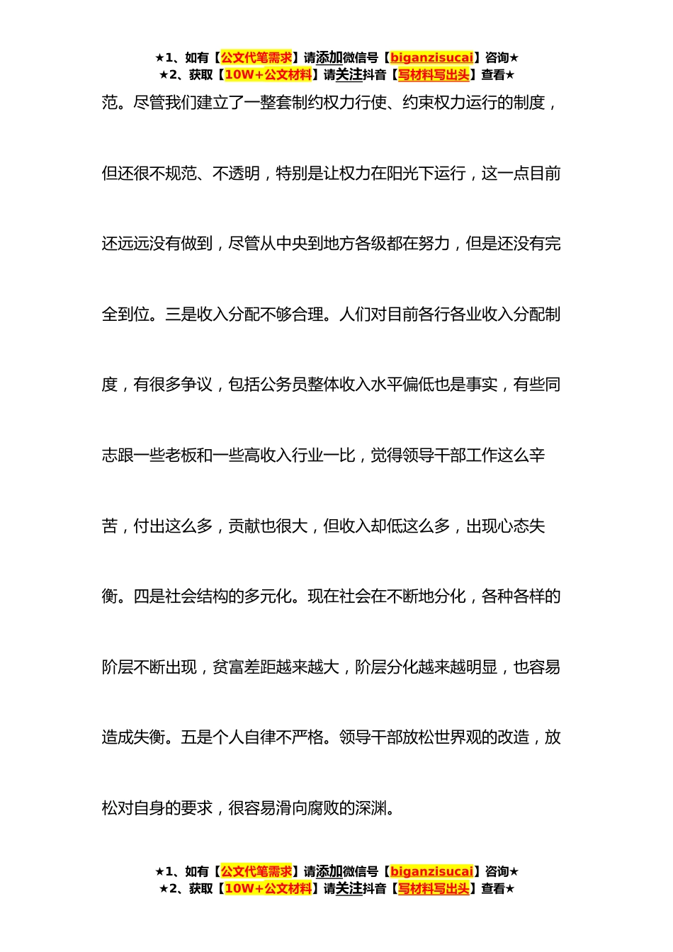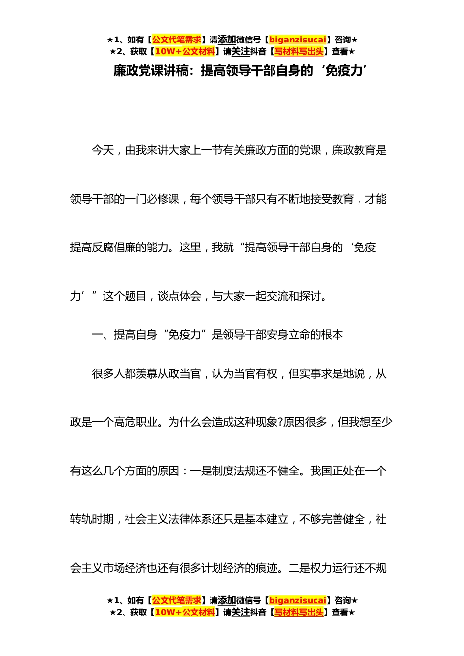 ★1、如有【公文代笔需求】请添加微信号【biganzisucai】咨询★★2、获取【10W+公文材料】请关注抖音【写材料写出头】查看★廉政党课讲稿:提高领导干部自身的‘免疫力’今天,由我来讲大家上一节有关廉政方面的党课,廉政教育是领导干部的一门必修课,每个领导干部只有不断地接受教育,才能提高反腐倡廉的能力。这里,我就“提高领导干部自身的‘免疫力’”这个题目,谈点体会,与大家一起交流和探讨。一、提高自身“免疫力”是领导干部安身立命的根本很多人都羡慕从政当官,认为当官有权,但实事求是地说,从政是一个高危职业。为什么会造成这种现象?原因很多,但我想至少有这么几个方面的原因:一是制度法规还不健全。我国正处在一个转轨时期,社会主义法律体系还只是基本建立,不够完善健全,社会主义市场经济...