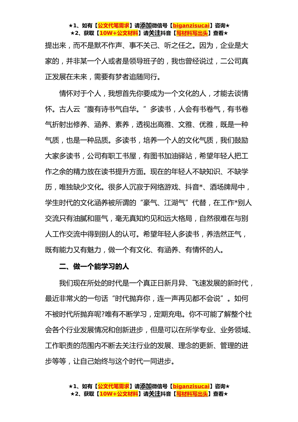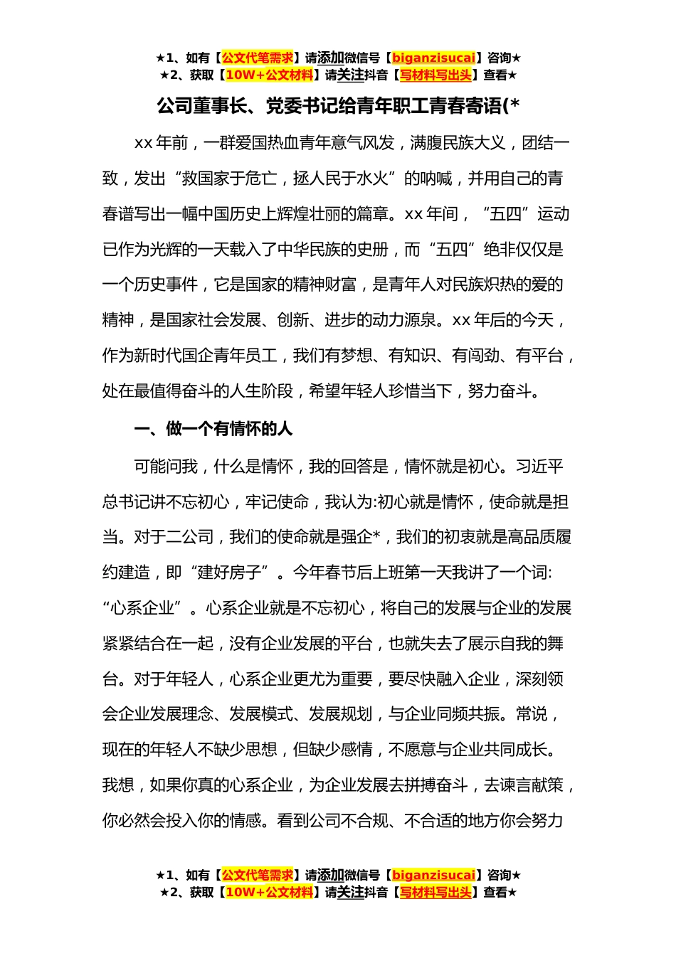 ★1、如有【公文代笔需求】请添加微信号【biganzisucai】咨询★★2、获取【10W+公文材料】请关注抖音【写材料写出头】查看★公司董事长、党委书记给青年职工青春寄语(*xx年前,一群爱国热血青年意气风发,满腹民族大义,团结一致,发出“救国家于危亡,拯人民于水火”的呐喊,并用自己的青春谱写出一幅中国历史上辉煌壮丽的篇章。xx年间,“五四”运动已作为光辉的一天载入了中华民族的史册,而“五四”绝非仅仅是一个历史事件,它是国家的精神财富,是青年人对民族炽热的爱的精神,是国家社会发展、创新、进步的动力源泉。xx年后的今天,作为新时代国企青年员工,我们有梦想、有知识、有闯劲、有平台,处在最值得奋斗的人生阶段,希望年轻人珍惜当下,努力奋斗。一、做一个有情怀的人可能问我,什么是情怀,我的...