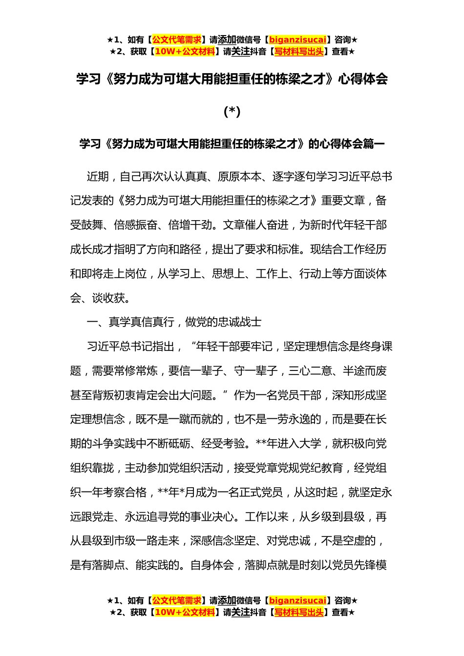 ★1、如有【公文代笔需求】请添加微信号【biganzisucai】咨询★★2、获取【10W+公文材料】请关注抖音【写材料写出头】查看★学习《努力成为可堪大用能担重任的栋梁之才》心得体会(*)学习《努力成为可堪大用能担重任的栋梁之才》的心得体会篇一近期,自己再次认认真真、原原本本、逐字逐句学习习近平总书记发表的《努力成为可堪大用能担重任的栋梁之才》重要文章,备受鼓舞、倍感振奋、倍增干劲。文章催人奋进,为新时代年轻干部成长成才指明了方向和路径,提出了要求和标准。现结合工作经历和即将走上岗位,从学习上、思想上、工作上、行动上等方面谈体会、谈收获。一、真学真信真行,做党的忠诚战士习近平总书记指出,“年轻干部要牢记,坚定理想信念是终身课题,需要常修常炼,要信一辈子、守一辈子,三心二意...