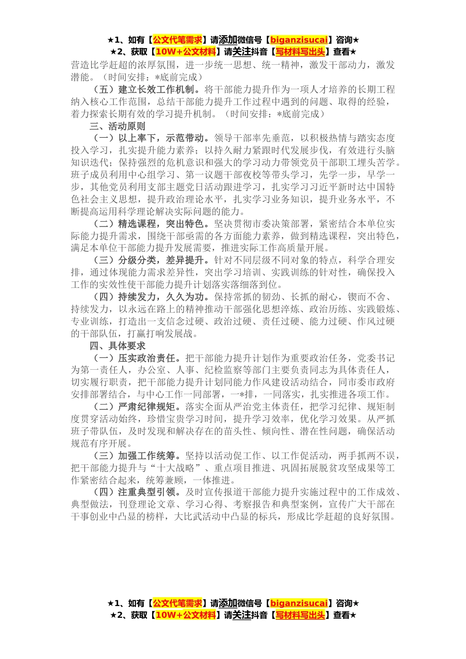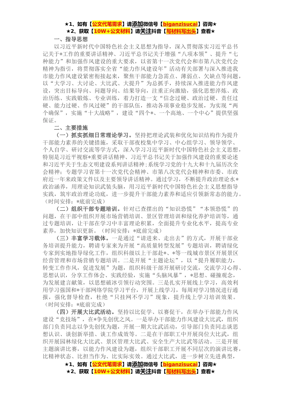 ★1、如有【公文代笔需求】请添加微信号【biganzisucai】咨询★★2、获取【10W+公文材料】请关注抖音【写材料写出头】查看★一、指导思想以习近平新时代中国特色社会主义思想为指导,深入贯彻落实习近平总书记关于*工作的重要讲话精神、习近平总书记关于增强“八项本领”、提升“七种能力”和加强作风建设的重大要求,以省第十一次党代会和市第八次党代会精神为指引,将贯彻落实全省“能力作风建设年”活动有关部署与深入推进我市能力作风建设紧密衔接起来,聚焦干部能力急需点、薄弱点、欠缺点等问题,以“大学习、大讨论、大比武、大提升”为总抓手,持续深入推进能力作风建设,突出目标导向、问题导向、结果导向,注重正向激励,强化思想淬炼、政治历练、实践锻炼、专业训练,着力打造一支“信念过硬、政治过硬...
