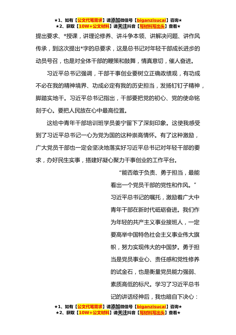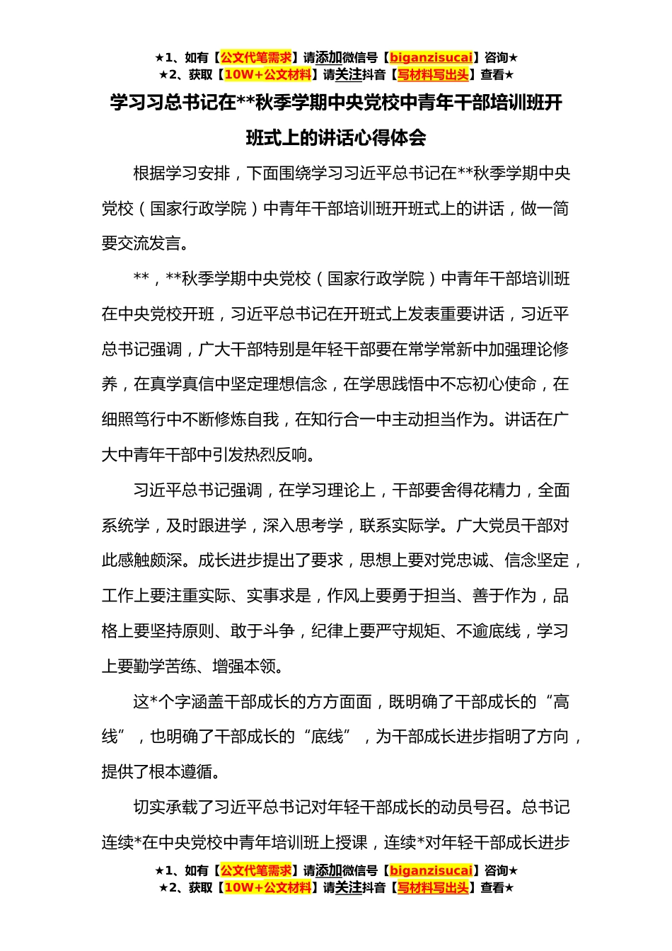 ★1、如有【公文代笔需求】请添加微信号【biganzisucai】咨询★★2、获取【10W+公文材料】请关注抖音【写材料写出头】查看★学习习总书记在**秋季学期中央党校中青年干部培训班开班式上的讲话心得体会根据学习安排,下面围绕学习习近平总书记在**秋季学期中央党校(国家行政学院)中青年干部培训班开班式上的讲话,做一简要交流发言。**,**秋季学期中央党校(国家行政学院)中青年干部培训班在中央党校开班,习近平总书记在开班式上发表重要讲话,习近平总书记强调,广大干部特别是年轻干部要在常学常新中加强理论修养,在真学真信中坚定理想信念,在学思践悟中不忘初心使命,在细照笃行中不断修炼自我,在知行合一中主动担当作为。讲话在广大中青年干部中引发热烈反响。习近平总书记强调,在学习理论上,干部要...