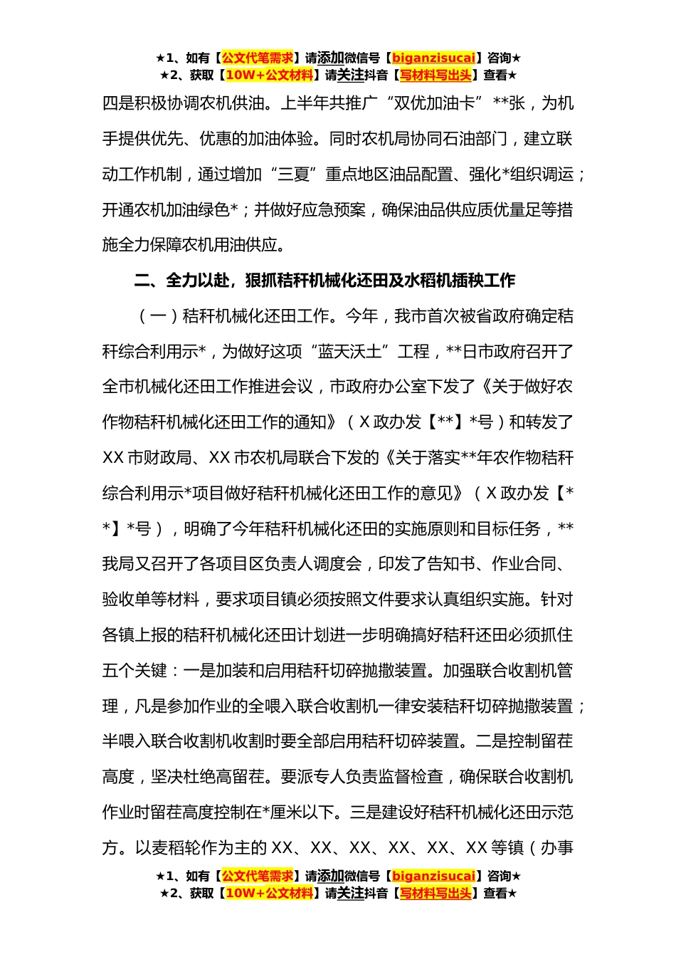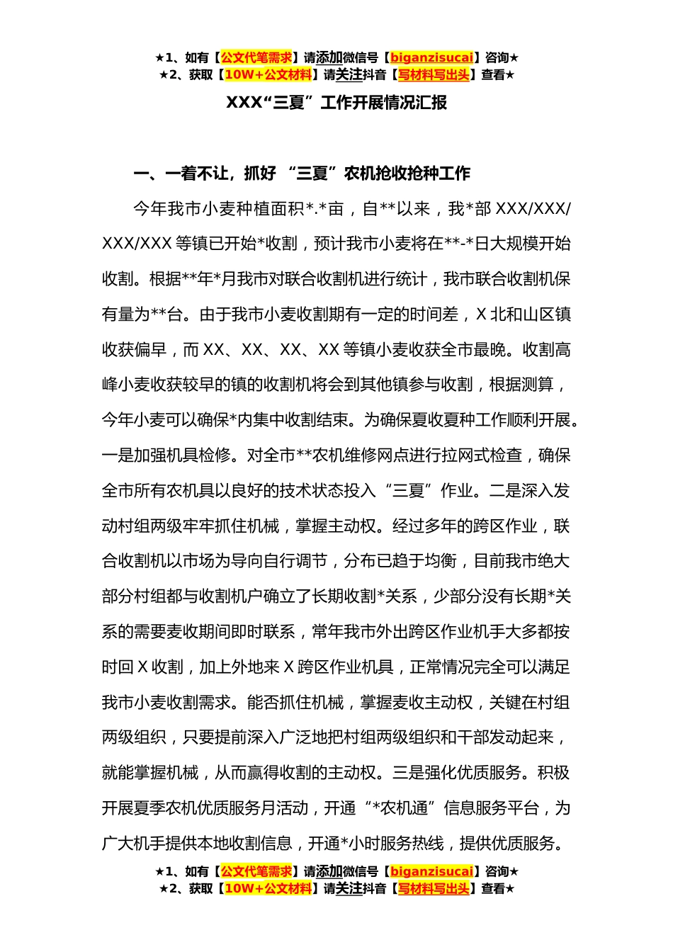 ★1、如有【公文代笔需求】请添加微信号【biganzisucai】咨询★★2、获取【10W+公文材料】请关注抖音【写材料写出头】查看★XXX“三夏”工作开展情况汇报一、一着不让,抓好“三夏”农机抢收抢种工作今年我市小麦种植面积*.*亩,自**以来,我*部XXX/XXX/XXX/XXX等镇已开始*收割,预计我市小麦将在**-*日大规模开始收割。根据**年*月我市对联合收割机进行统计,我市联合收割机保有量为**台。由于我市小麦收割期有一定的时间差,X北和山区镇收获偏早,而XX、XX、XX、XX等镇小麦收获全市最晚。收割高峰小麦收获较早的镇的收割机将会到其他镇参与收割,根据测算,今年小麦可以确保*内集中收割结束。为确保夏收夏种工作顺利开展。一是加强机具检修。对全市**农机维修网点进行拉网式检查,确保全市所有农机具以良好的技...