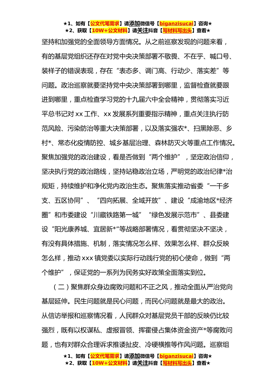 ★1、如有【公文代笔需求】请添加微信号【biganzisucai】咨询★★2、获取【10W+公文材料】请关注抖音【写材料写出头】查看★巡察组组长在县委巡察组巡察xxx镇党委工作动员会上的讲话同志们:经县委批准,按照县委巡察工作领导小组统一部署,县委第四巡察组从x月x日起对xxx镇党委开展巡察工作。今天巡察工作动员会的主要任务是:通报本次巡察任务,安排部署巡察工作。下面,我就做好本次巡察工作讲几点意见。一、增强政治巡察意识,坚决落实本轮巡察要求巡察是党内监督的重要战略性制度安排,是党章赋予的重要职责,是推进全面从严治党的重要举措,是国之利器、党之利器。巡察是政治监督,不是一般业务检查和工作督查。此次巡察,县委第四巡察组将坚持以习近平新时代中国特色社会主义思想为指导,以党的十九届六中...