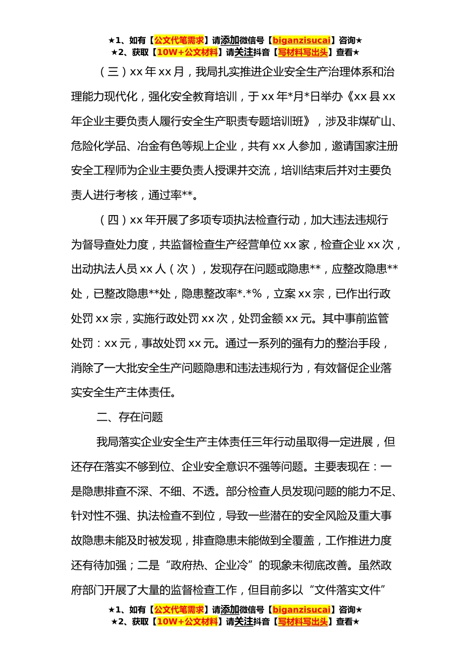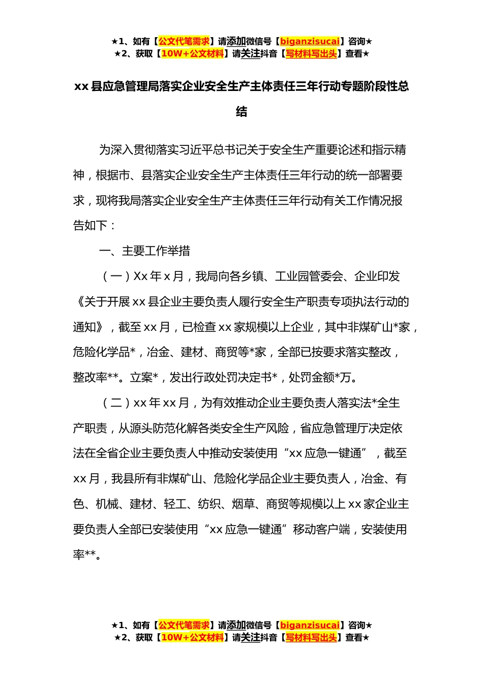 ★1、如有【公文代笔需求】请添加微信号【biganzisucai】咨询★★2、获取【10W+公文材料】请关注抖音【写材料写出头】查看★xx县应急管理局落实企业安全生产主体责任三年行动专题阶段性总结为深入贯彻落实习近平总书记关于安全生产重要论述和指示精神,根据市、县落实企业安全生产主体责任三年行动的统一部署要求,现将我局落实企业安全生产主体责任三年行动有关工作情况报告如下:一、主要工作举措(一)Xx年x月,我局向各乡镇、工业园管委会、企业印发《关于开展xx县企业主要负责人履行安全生产职责专项执法行动的通知》,截至xx月,已检查xx家规模以上企业,其中非煤矿山*家,危险化学品*,冶金、建材、商贸等*家,全部已按要求落实整改,整改率**。立案*,发出行政处罚决定书*,处罚金额*万。(二)xx年xx月,...