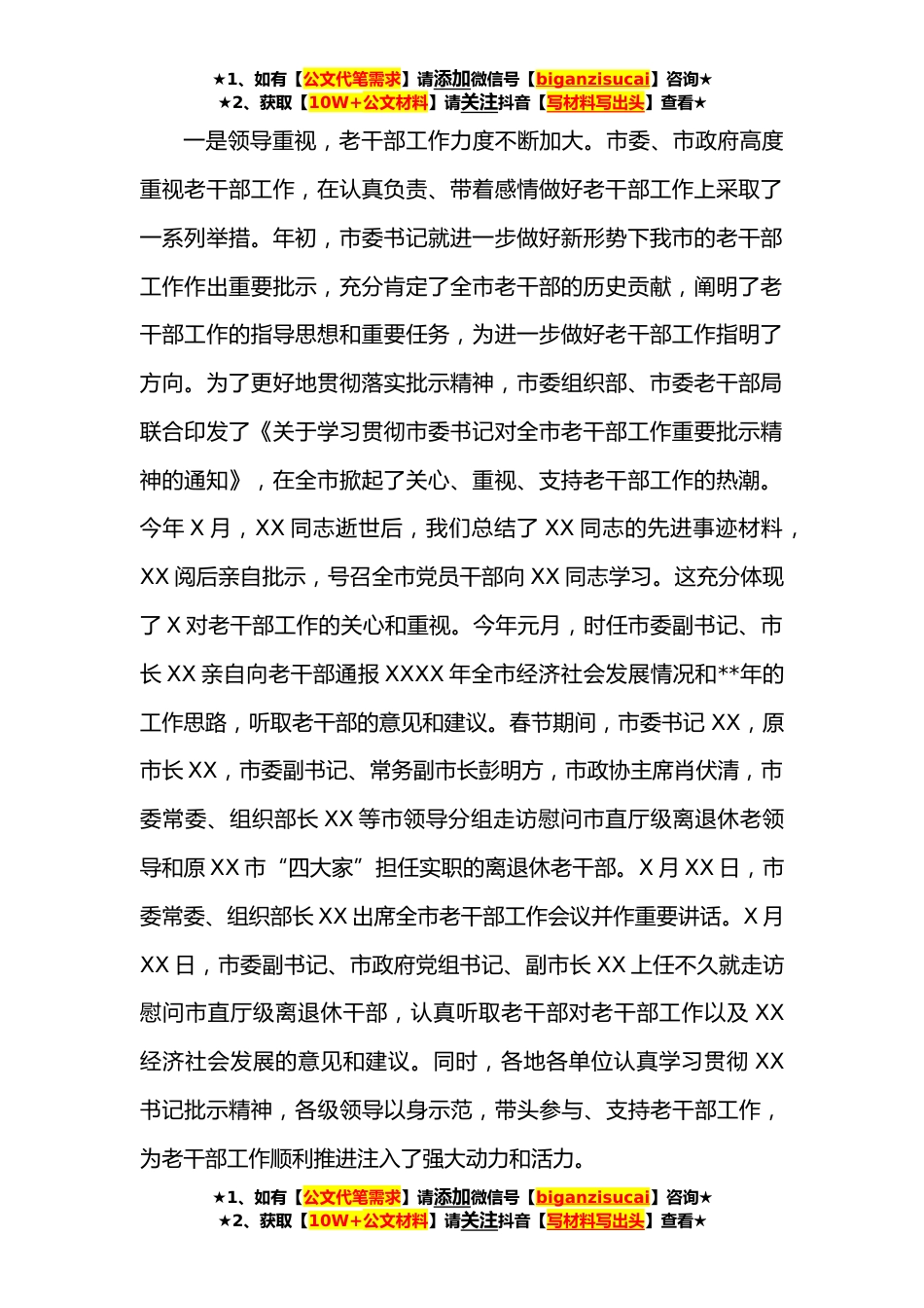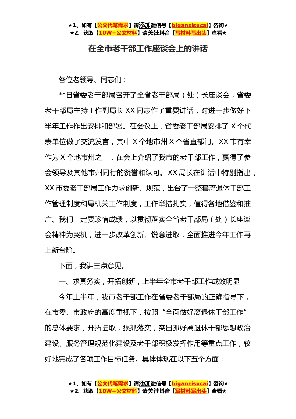 ★1、如有【公文代笔需求】请添加微信号【biganzisucai】咨询★★2、获取【10W+公文材料】请关注抖音【写材料写出头】查看★在全市老干部工作座谈会上的讲话各位老领导、同志们:**日省委老干部局召开了全省老干部局(处)长座谈会,省委老干部局主持工作副局长XX同志作了重要讲话,对进一步做好下半年工作作出安排和部署。在会议上,省委老干部局安排了X个代表单位做了交流发言,其中X个地市州X个省直部门。XX市有幸作为X个地市州之一,在会上介绍了我市的老干部工作,赢得了参会领导及其他市州同行的赞誉和认可。XX局长在讲话中特别指出,XX市委老干部局工作力求创新、规范,出台了一整套离退休干部工作管理制度和局机关工作制度,工作举措扎实,值得各地借鉴和推广。我们一定要珍惜成绩,以贯彻落实全省老干部...