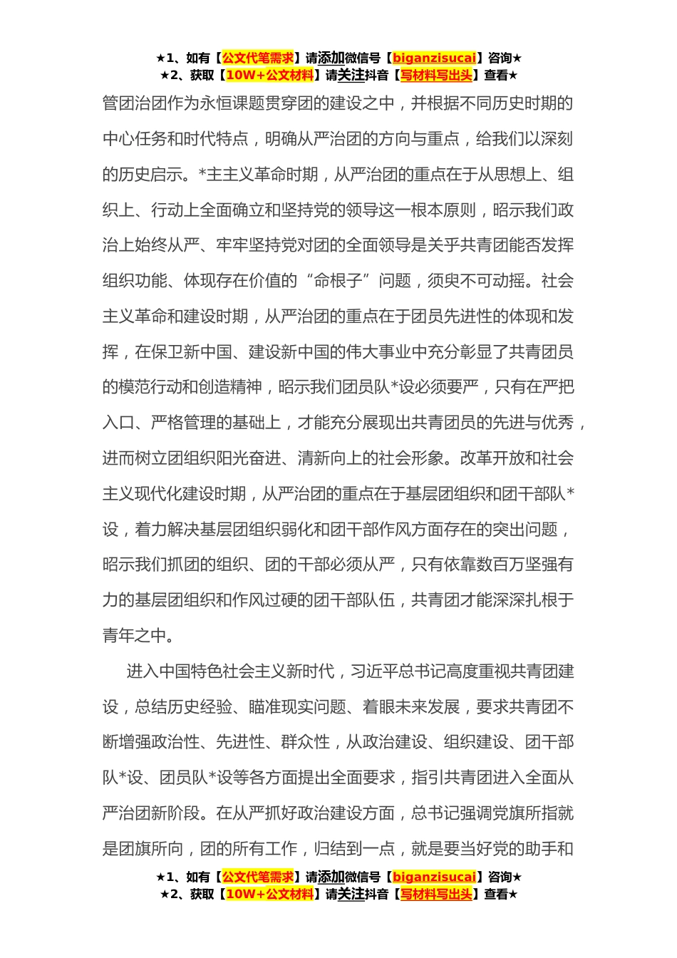★1、如有【公文代笔需求】请添加微信号【biganzisucai】咨询★★2、获取【10W+公文材料】请关注抖音【写材料写出头】查看★团委书记党课讲稿:以自我革命精神深入推进全面从严治团今年将要召开党的二十大,这是党和国家政治生活中的一件大事。今年也是党缔造成立共青团**年,这是中国青年运动史上的一件大事。当此时刻,全团都要认真思考:共青团应当以什么样的组织面貌、精神风貌迎接党的二十大?应当以什么样的工作状态、奋斗姿态紧跟党走好新时代的长征路?习近平总书记指出,“一个人也好,一个政党也好,最难得的就是历经沧桑而初心不改、饱经风霜而本色依旧”;“做到不忘初心、牢记使命,并不是一件容易的事情,必须有强烈的自我革命精神”。党的十八大以来,以习近平同志为核心的党中央,坚持十年磨一剑...